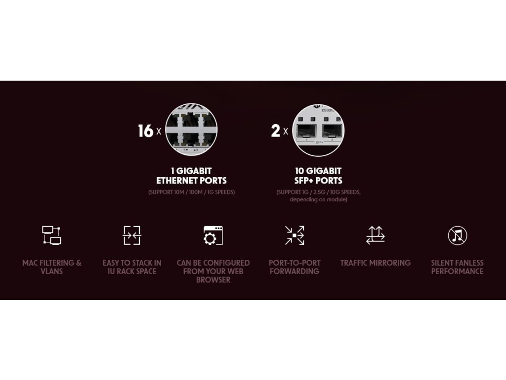Managovatelný rackmount switch od MikroTiku je ideální pro kanceláře, domácnosti nebo prostředí s datovým rozvaděčem. Nabízí 16x Gigabit LAN a 2x SFP+ porty s širokou podporou rychlostí 1, 2.5 a 10 Gbps. Switch lze snadno instalovat na stůl nebo do 10"/19" racku, případně 2 vedle sebe do 19" racku. Napájení zajišťuje vestavěný zdroj na 230V AC. Operační systém SwOS Lite umožňuje pokročilou správu s funkcemi jako monitoring rozhraní, VLAN, QoS, filtrování MAC adres či Broadcast storm control.Klíčové vlastnosti