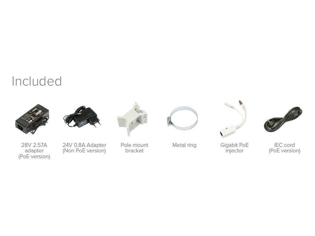 Součástí dodávky napájecí zdroj, PoE injektor a montážní příslušenství.