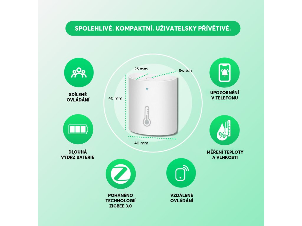 •Senzor umožňuje měřit aktuální teplotu a vlhkost.