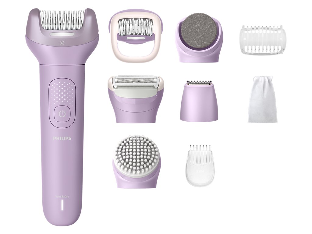 Bezdrátový epilátor Wet & Dry Series 8500.Epilátor s LED světlem (3 režimy), hlavice ProGuide, pilník na chodidla, zastřihovač bikin s hřebenem, exfoliační kartáč, holicí hlavice s hřebenem, kartáček na čištění pleti, základní pouzdro.