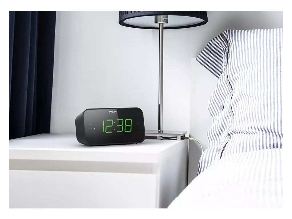Čistý a jednoduchý displej hodin s velkými číslicemiDíky tomuto radiobudíku FM okamžitě zjistíte čas. Velké číslice znamenají, že lze displej dobře přečíst z libovolného úhlu, a vy můžete upravit jas tak, aby vyhovoval podmínkám místnosti. Snadné ovládání se postará o nastavení budíku, hlasitosti a ladění.