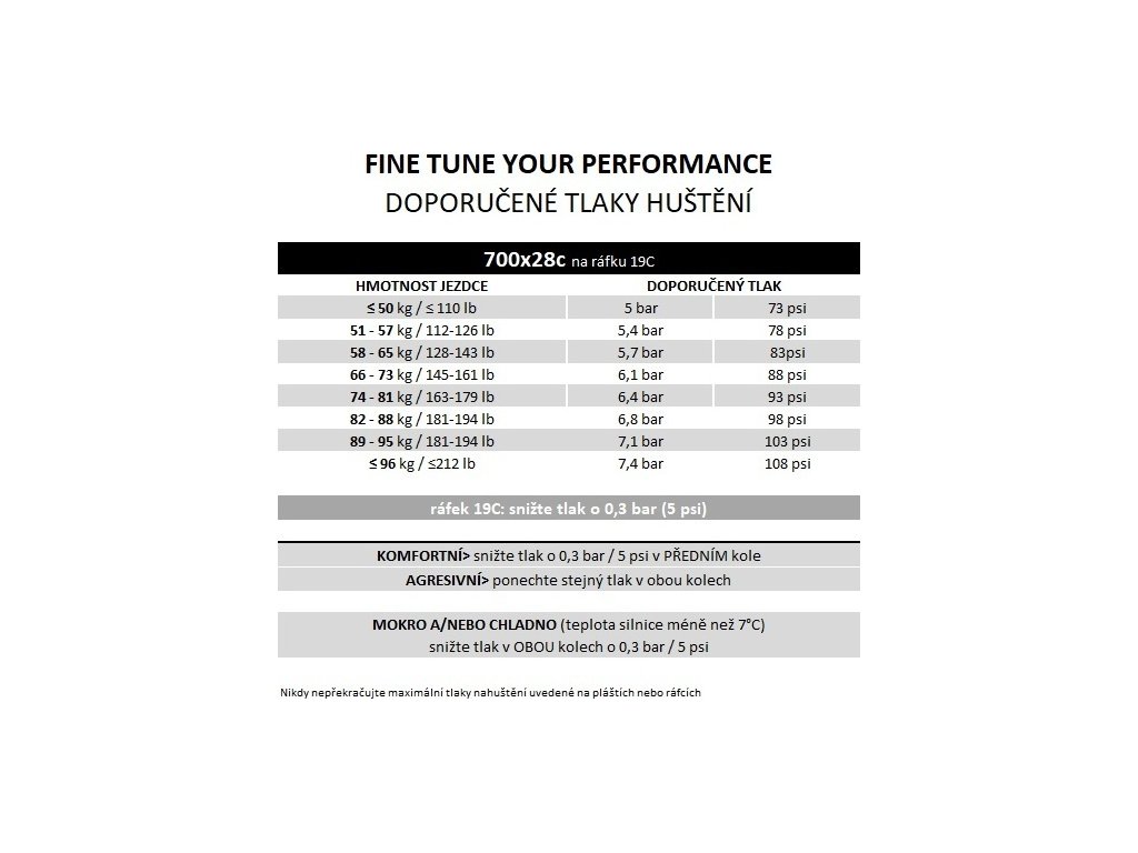- Kompatibilita hookless (ráfky bez hrany patky): Rozměry 26-622 a menší NEJSOU kompatibilní s hookless ráfky. Rozměry 28-622 a větší JSOU kompatibilní s hookless ráfky podle standardu ETRTO (5bar/73psi max. tlak huštění).