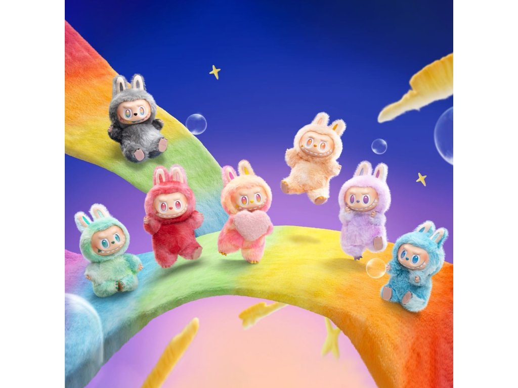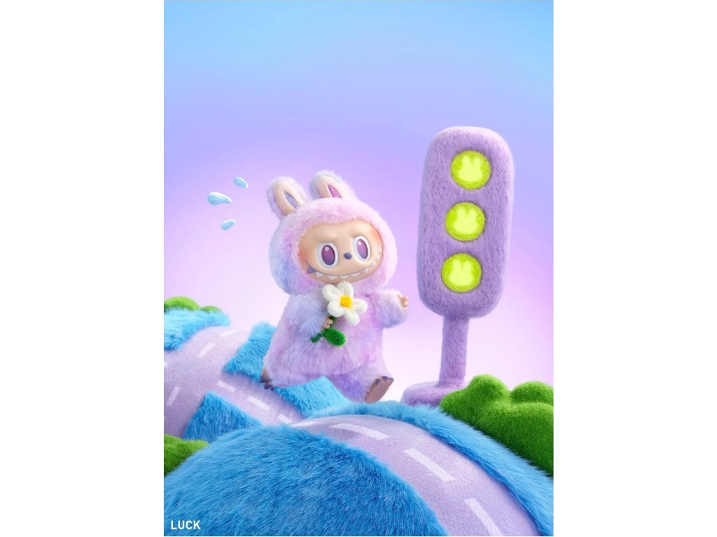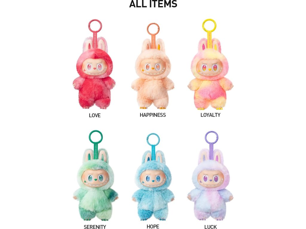 * Luck: Hravá figurka Labubu, která přináší štěstí. Její kožíšek je kombinací pastelově růžové a modré. Tato veselá barevná kombinace symbolizuje radost a pozitivní energii.