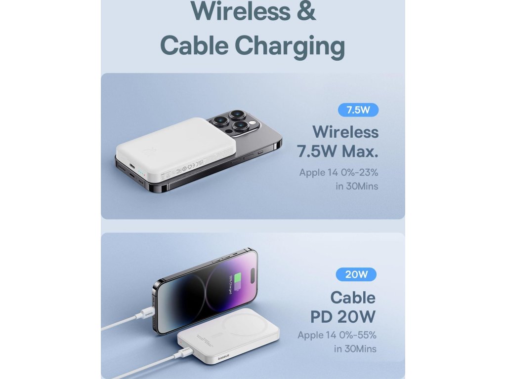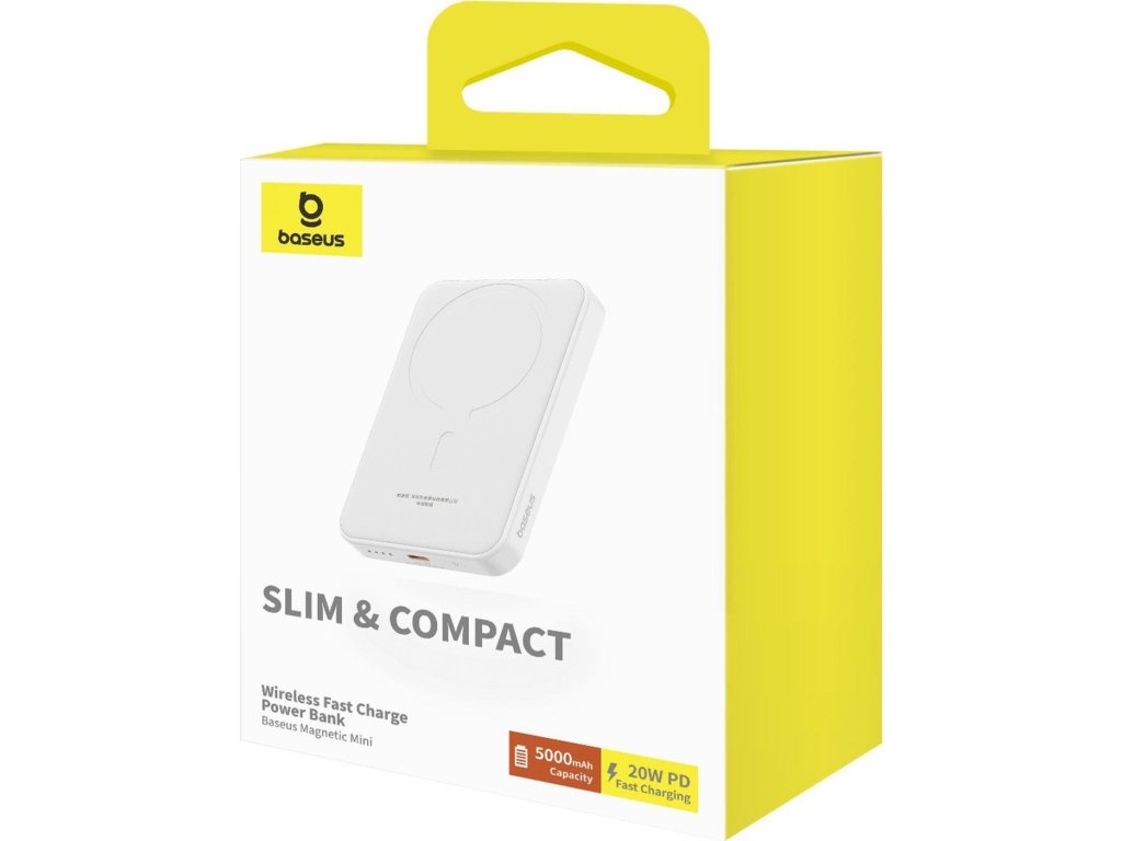 Pohodlné nabíjeníMagnetická mini powerbanka Baseus je ideálním řešením pro všechny, kteří si cení pohodlného nabíjení svých zařízení. Díky velké kapacitě 5000 mAh vám tato malá powerbanka umožní několikrát dobít smartphone, aniž byste museli hledat zásuvku nebo přerušovat používání zařízení. Jeho magnetický design je nejen estetický, ale také funkční, protože pevně přilne k vašemu telefonu a umožňuje bezdrátové nabíjení mimořádně pohodlným způsobem. Nyní si můžete užívat plný komfort a spolehlivý výkon kdekoli a kdykoli.Promyšlený DesignZařízení Baseus vyniká nejen svým výkonem, ale také promyšleným designem. Díky své malé tloušťce, pouhých 14,7 mm, se pohodlně vejde do kapsy nebo kabelky, takže je vynikajícím společníkem na každou cestu nebo při každodenním používání. I přes své kompaktní rozměry zaručuje bezpečné nabíjení vašeho zařízení, takže se nemusíte bát případného poškození vašeho zařízení. Tato powerbanka dokonale kombinuje praktičnost s elegantním designem a splní očekávání i těch nejnáročnějších uživatelů.Technické parametry:- Kapacita: 5000 mAh- Typ baterie: Lithium Polymer- Výstup USB-C: 5V=3A, 9V=2A- Vstup USB-C: 5V=2,4A; 9V=2,22A; 12V=1,5ADoplňkové parametry