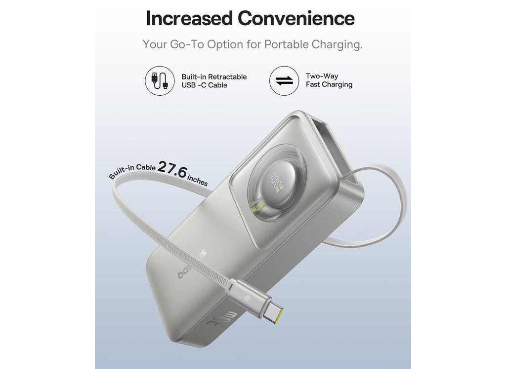 Vestavěný 70 cm dlouhý USB-C kabel je řešením, které odstraňuje problém se zamotanými kabely a nutnost nosit s sebou další vychytávky. Kabel se snadno odvíjí a schovává v pouzdře powerbanky, díky čemuž je jeho používání mimořádně pohodlné. Prošel testem ohybu 50 000, který prokazuje jeho odolnost a spolehlivost i při intenzivním používání.