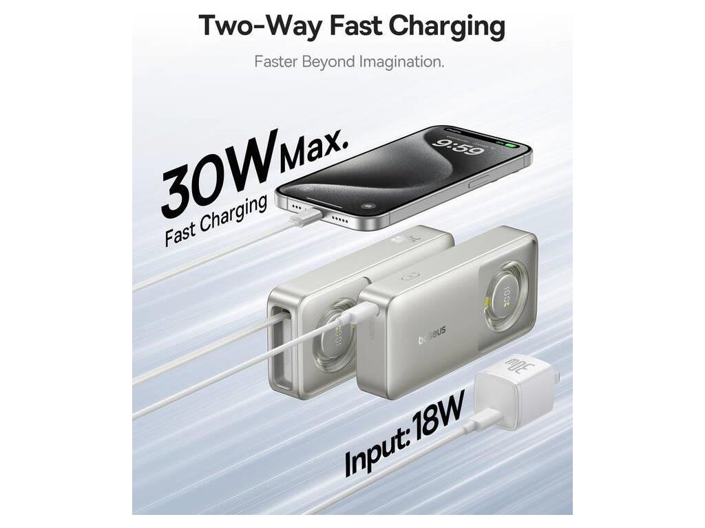 Powerbanka Baseus Free2Pull nabízí rychlé nabíjení. USB-C kabel a USB-C port umožňují nabíjet zařízení s výkonem až 30W a samotnou powerbanku nabijete výkonem až 18W. To znamená, že bez ohledu na to, zda nabíjíte telefon, tablet nebo jen powerbanku, celý proces je rychlý a efektivní.