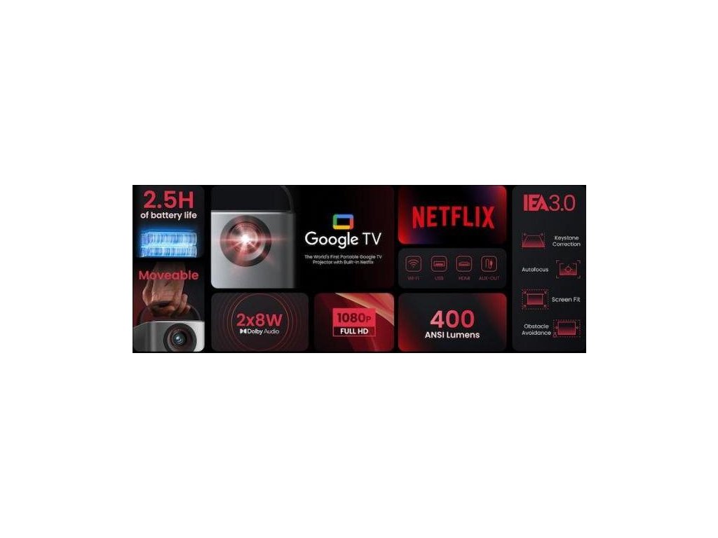 Vezměte si velkou obrazovku kamkoli: Tento přenosný projektor Google TV vám umožní sledovat veškerý váš oblíbený obsah a aplikace – včetně Netflixu – ať jste kdekoli.150“ obraz kdekoli: Vychutnejte si skutečně filmový zážitek s bohatými detaily a vysokou čistotou díky displeji Full HP (1920 x 1080) a jasu 400 ANSI lumenů.