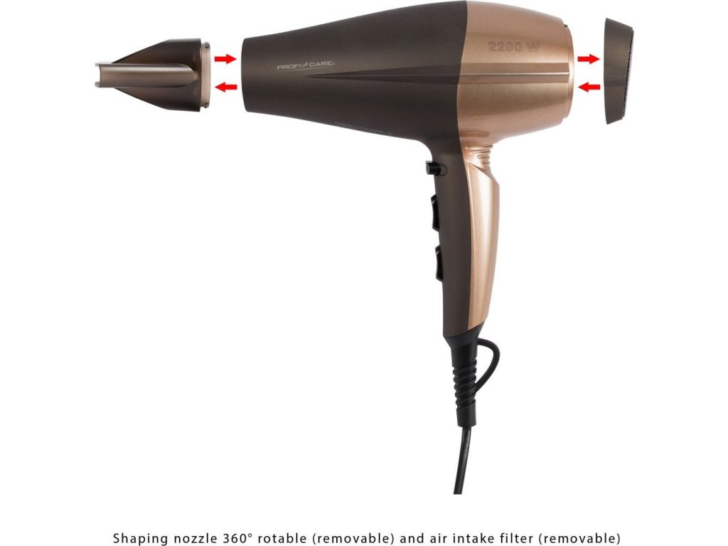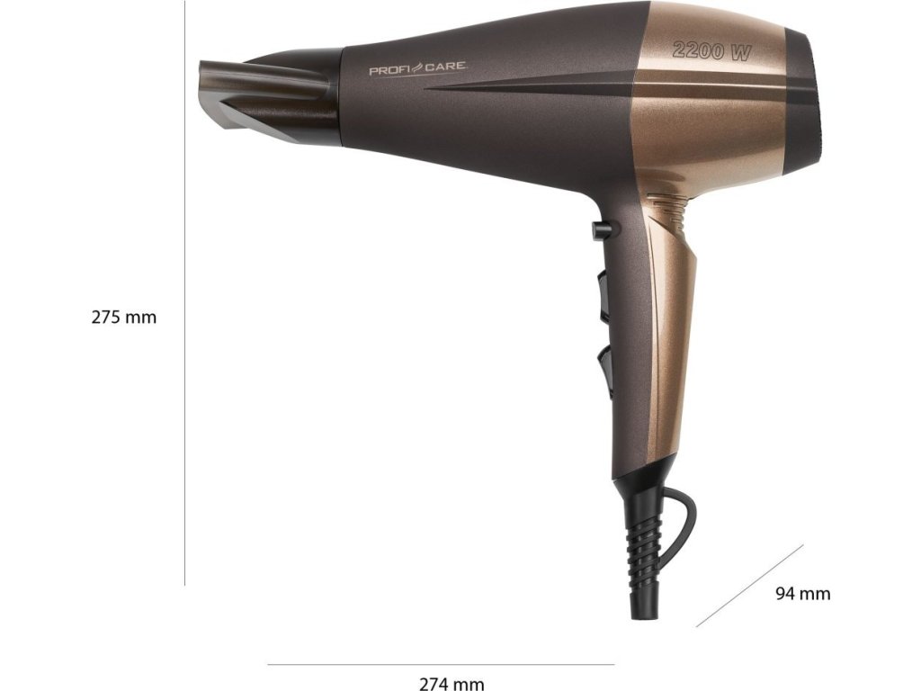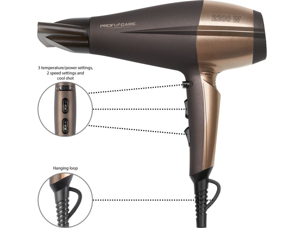 I vy můžete mít vlasy každý den jako od kadeřníka. Kvalitní a spolehlivý fén ProfiCare 3010 BR s příkonem 2 200 W se postará nejen o klasické vysušení vašich vlasů, ale také může přispět ke skvělému účesu. Na první pohled vás zaujme svým poutavým designem, ale i odnímatelným koncentrátorem vzduchu. Fén vám nabídne rovnou několik funkcí, které vám usnadní fénování vlasů. Po zapnutí fénu spodním tlačítkem, si můžete vybrat ze 3 teplotních stupňů (nízká, střední a vysoká teplota), které můžete regulovat 2 rychlostmi (slabé a silné foukání). Fén se nepřehřeje ani při navolení nejvyšší teploty a nejrychlejšího programu. Je zabezpečen ochranou proti přehřátí.Vlasy jako ze salónu