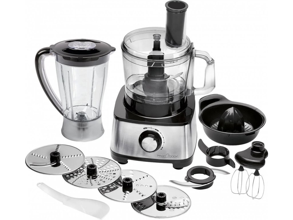 Mezi příslušenství patří citrusovač, 2x struhadlový kotouč a 2x řezný kotouč, bramborový rošt, sekáček, šlehací metla, hnětací metla a škrabka. Přísavné nožičky zajišťují vysokou stabilitu během používání.