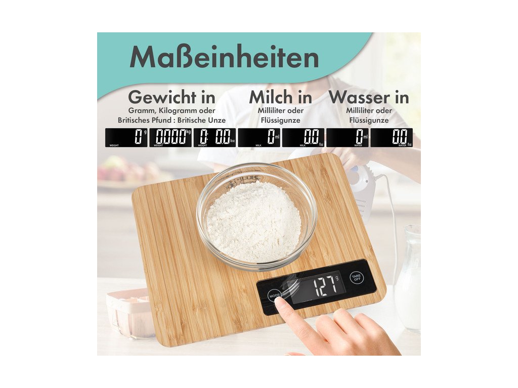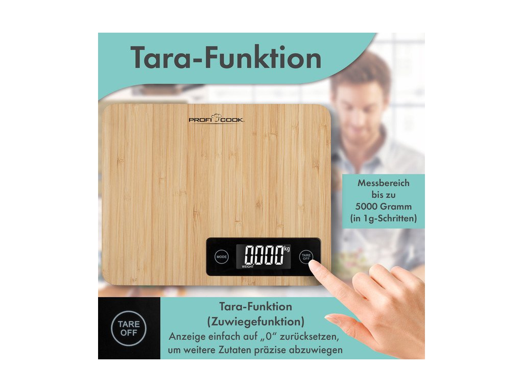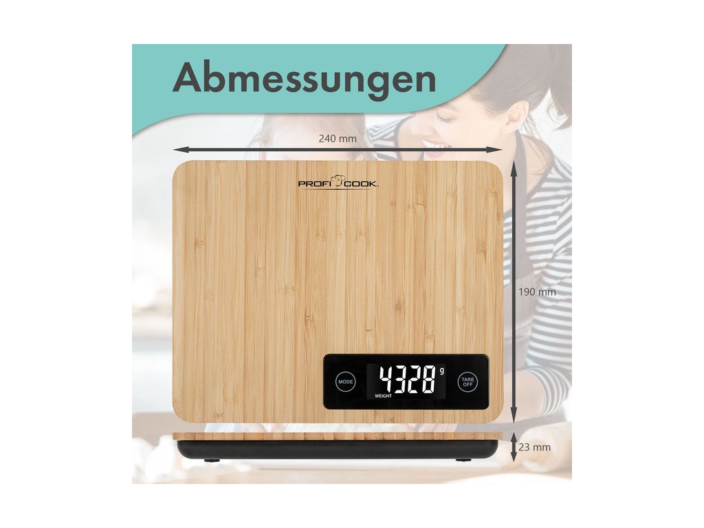 Jestliže potřebujete praktického pomocníka do kuchyně, který vám pomůže s přípravou pokrmů, dejte šanci kuchyňské váze ProfiCook. Váha je s hladkou plochou, která umožňuje přímé pokládání surovin ke zvážení. Nadchnou vás zajímavé funkce, například TARE a automatické vypnutí. Pro její výrobu výrobce zvolil oblíbený bambus, jenž je velmi odolný. Kromě samotné váhy je v balení rovněž návod. Aby vše správně fungovalo, jsou zapotřebí 3 AAA baterie. Váha do kuchyně ProfiCook má rozměry 2,3 × 24 × 19 cm (vך×h).Provoz na baterie: 3 x 1,5 V AAA (baterie nejsou součástí balení)