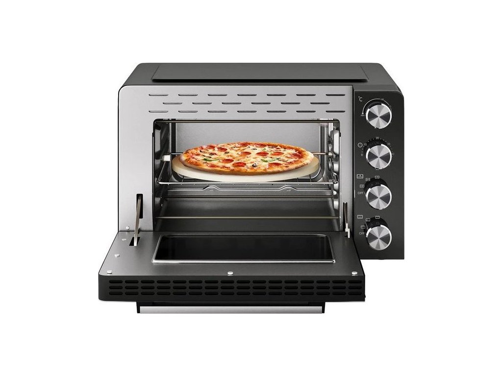 - Bohaté příslušenství: grilovací rošt, pečící plech, otočný rožeň, pizza kámen (O 30 cm), kleště pro vyjmutí grilovací mřížky a plech na pečení, nástroj pro vyjmutí otočného rožně, odkapávací miska na tuk a drobky.