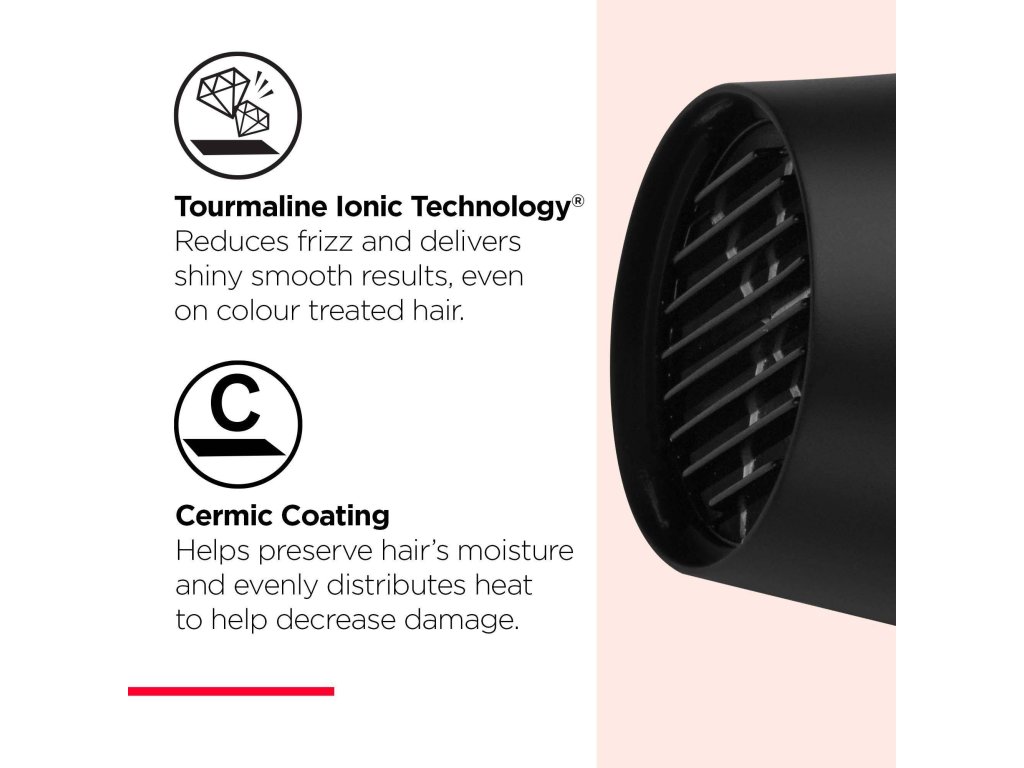 Ionizační technologie obohacená o turmalín pomáhá výrazně redukovat nežádoucí krepatění vlasů, a to i v případě vysoké vlhkosti. Vlasy jsou díky ní po vysušení hladké, lesklé a příjemně hebké na dotek. Technologie zároveň uzavírá vlasové kutikuly, což zajišťuje zdravější vzhled účesu. Výhodou je, že tento šetrný způsob sušení je vhodný i pro barvené vlasy – pomáhá zachovat jejich sytou barvu a vitalitu, aniž by je vysušoval nebo poškozoval.