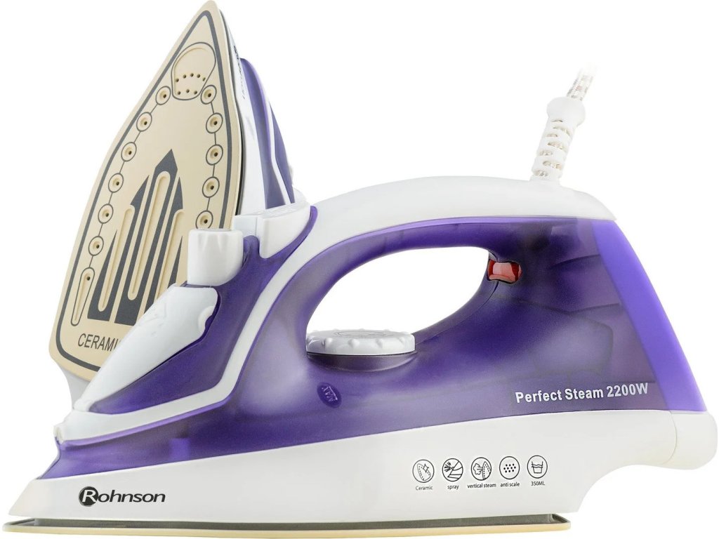 Napařovací žehlička Rohnson R-331 s keramickou žehlící plochou a výkonem 2200 W disponuje systémem odvápňování Anti-Calc a samočištění Self-Cleaning.