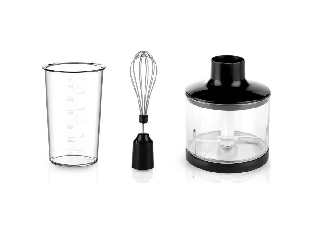 Příslušenství vhodné i do myčky nádobí: sekáček potravin 500 ml, mixovací nádoba s měrkou 600 ml, šlehací metla
