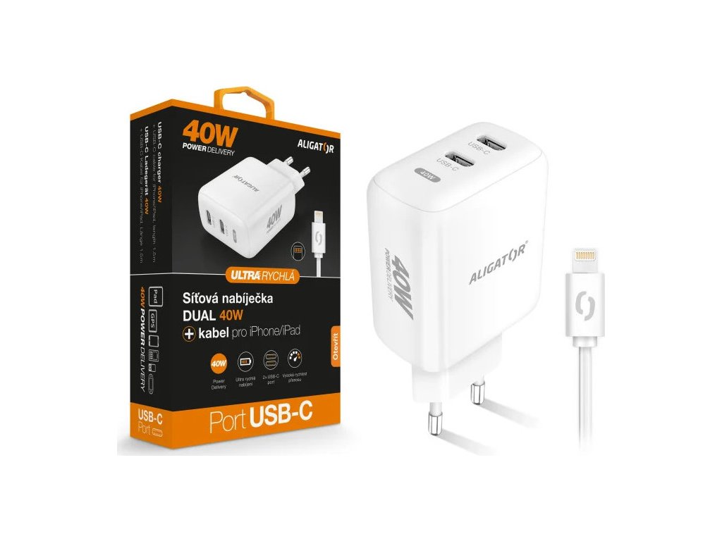 Rychlá nabíječka ALIGATOR, PD 40W, 2xUSB-C, USB-C/Lightning kabel, bílá