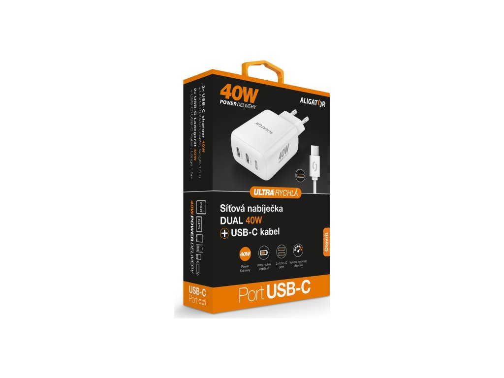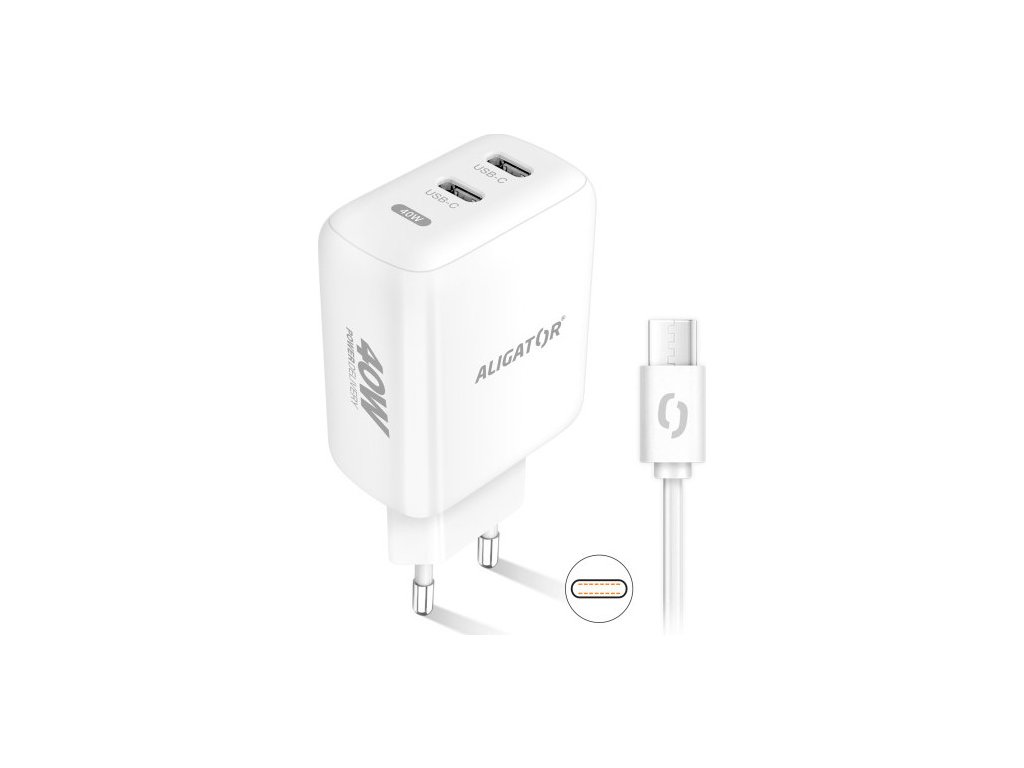 Rychlá nabíječka ALIGATOR, PD 40W, 2xUSB-C, USB-C/USB-C kabel, bílá