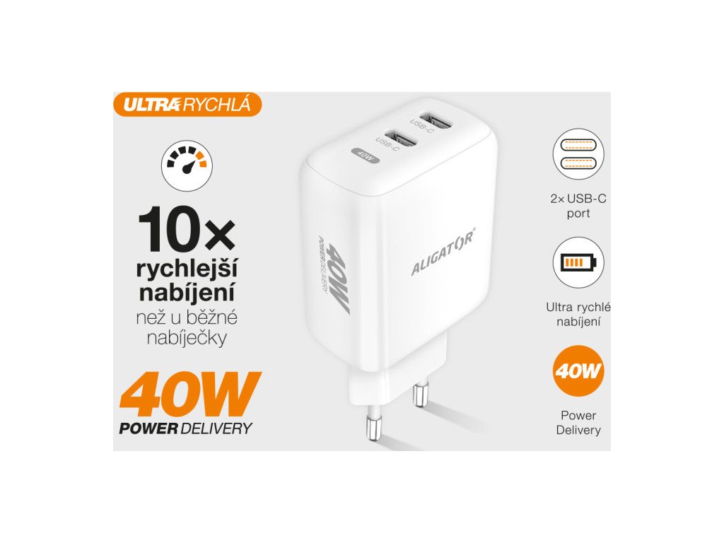 V dnešní době jsou již konektory USB-C s podporou protokolu PD standardem pro nabíjení mobilních zařízení. Chytrá síťová nabíječka ALIGATOR POWER DELIVERY 40W zvládne tak hravě doplnit energii dvěma přístrojům najednou díky ultra rychlým USB-C portům o celkovém výkonu až 40W. Tato nabíječka je ideálním pomocníkem pro dobíjení mobilních telefonů, tabletů a jiných zařízení.