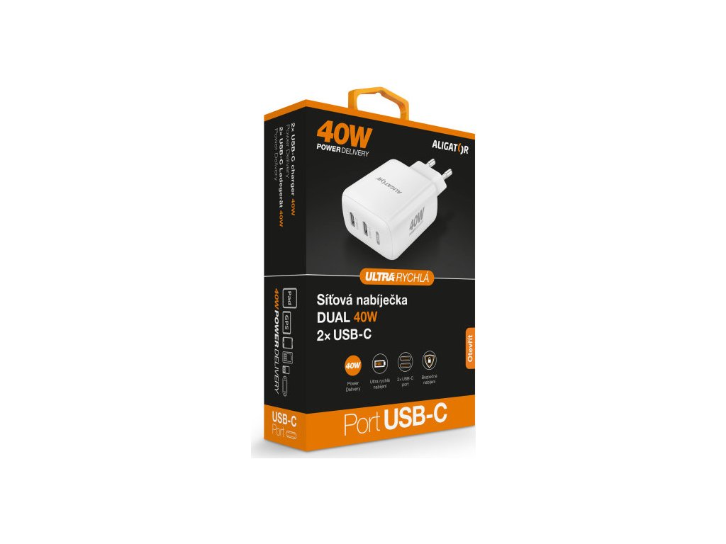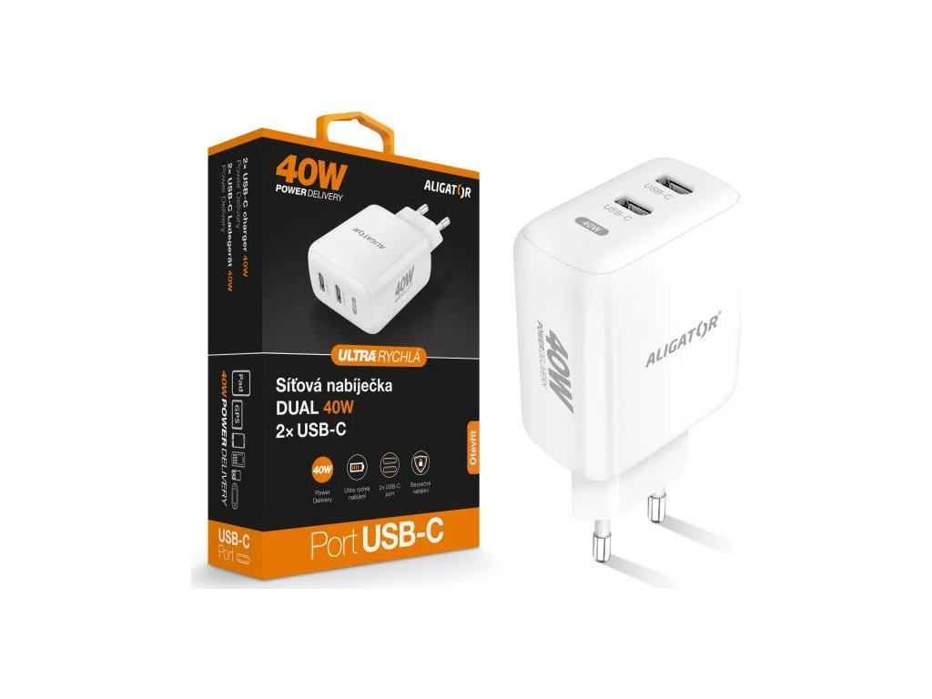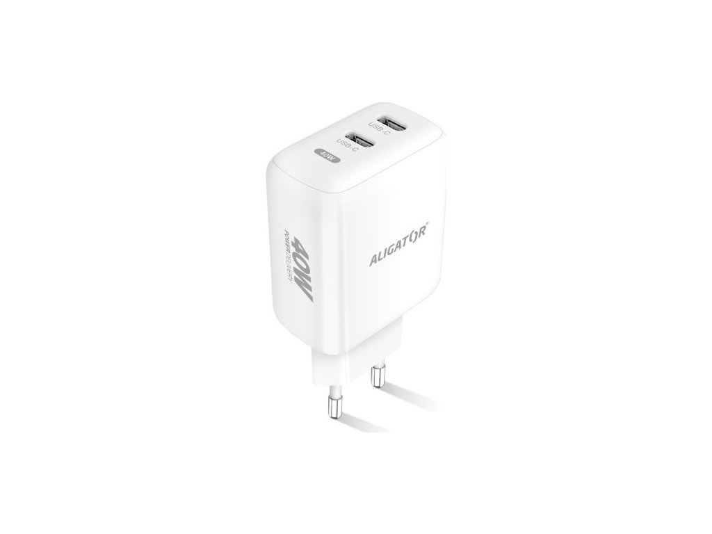 Rychlá nabíječka ALIGATOR, PD 40W 2xUSB-C, bílá