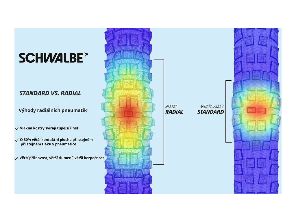 Zaručuje bezpečnost a kontrolu ve všech situacích Radiální kostra zvětšuje kontaktní plochu a mnohem lépe filtruje nerovnosti: větší přilnavost, větší pohodlí a větší bezpečnost Plášť se doslova vcucne do země, protože se selektivněji deformuje Profil optimalizovaný pro radiální kostru: mnoho hrotů pro maximální kontrolu a dobrou odolnostParametry