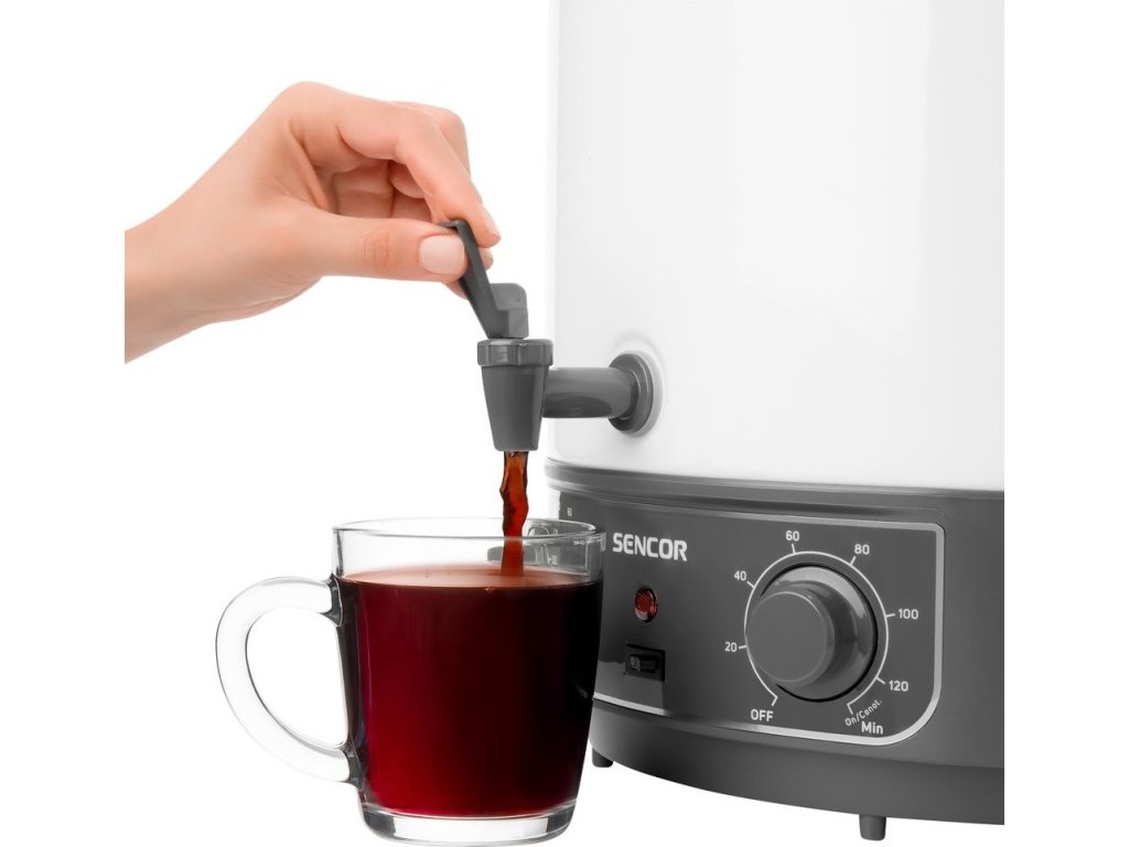 Vestavěný výtokový kohout vhodný pro stáčení např. svařeného vína, čaje, punče nebo jiných horkých nápojů