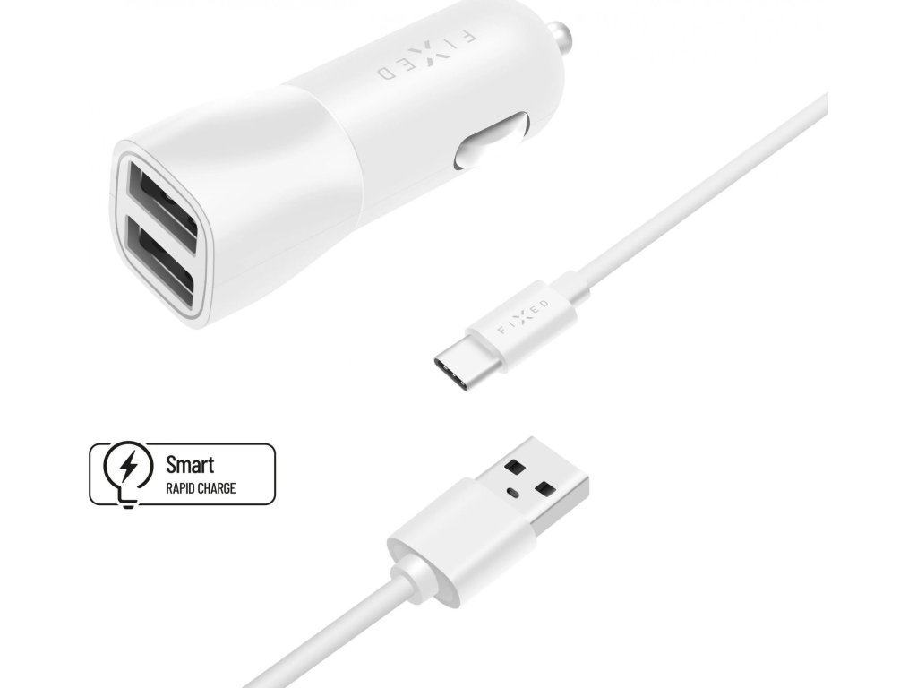 Set autonabíječky FIXED s 2xUSB výstupem a USB/USB-C kabelu, 1 metr, 15W Smart Rapid Charge, bílá