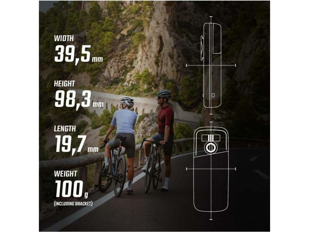 6 režimů: vysoká svítivost (15 h), denní blikání (21 h), noční blikání (23 h). Peloton (25 h), ECO blikání (27 h), radar (30 h)