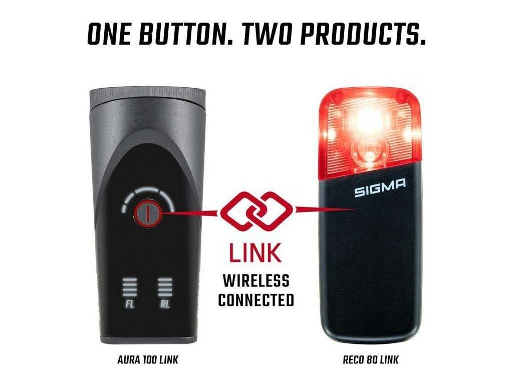 RECO 81 LINK je kompatibilní s předním světlem SIGMA AURA 100 Link. Toto spojení vytváří inteligentní kombinaci osvětlení, ve které lze pohodlně ovládat obě světla a sledovat úroveň baterie. To umožní ovládat obě světla jedním stiskem tlačítka – jednoduché, bezpečné a chytré.