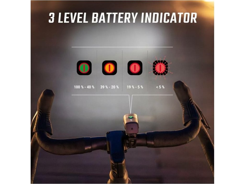 Třistupňový indikátor stavu baterie zobrazuje stav baterie jak při nabíjení, tak při svícení. Aktuální stav nabití akumulátoru zobrazuje indikátor integrovaný v tlačítku ON/OFF. Barva Led diody indikuje zbývající kapacitu baterie.