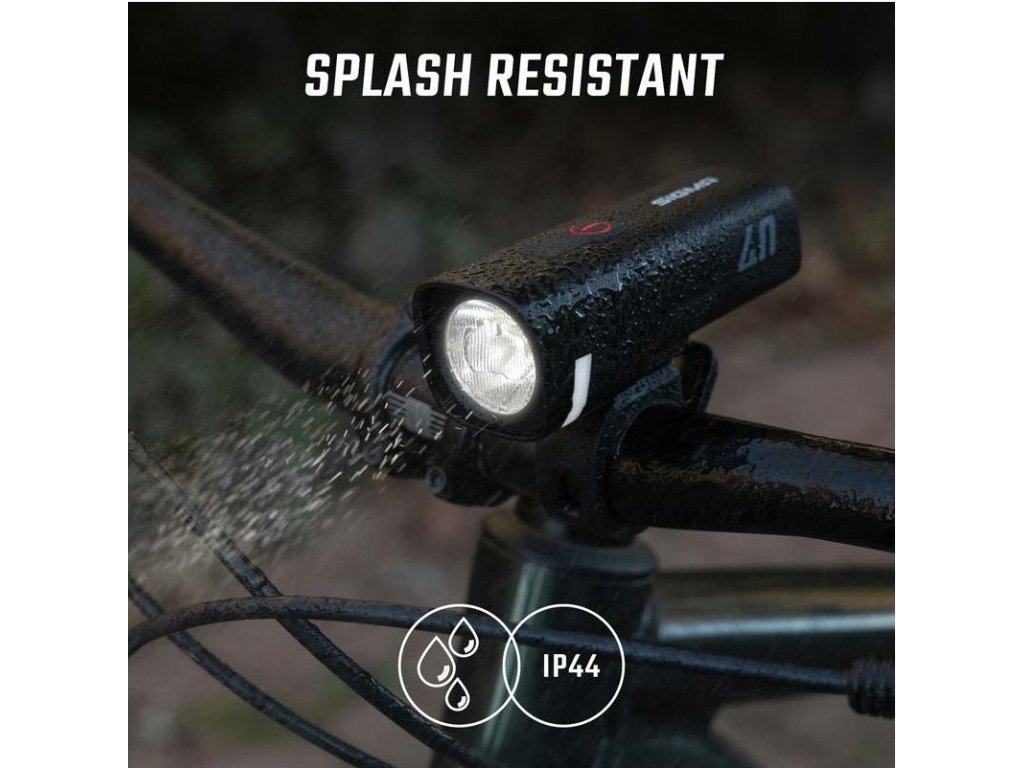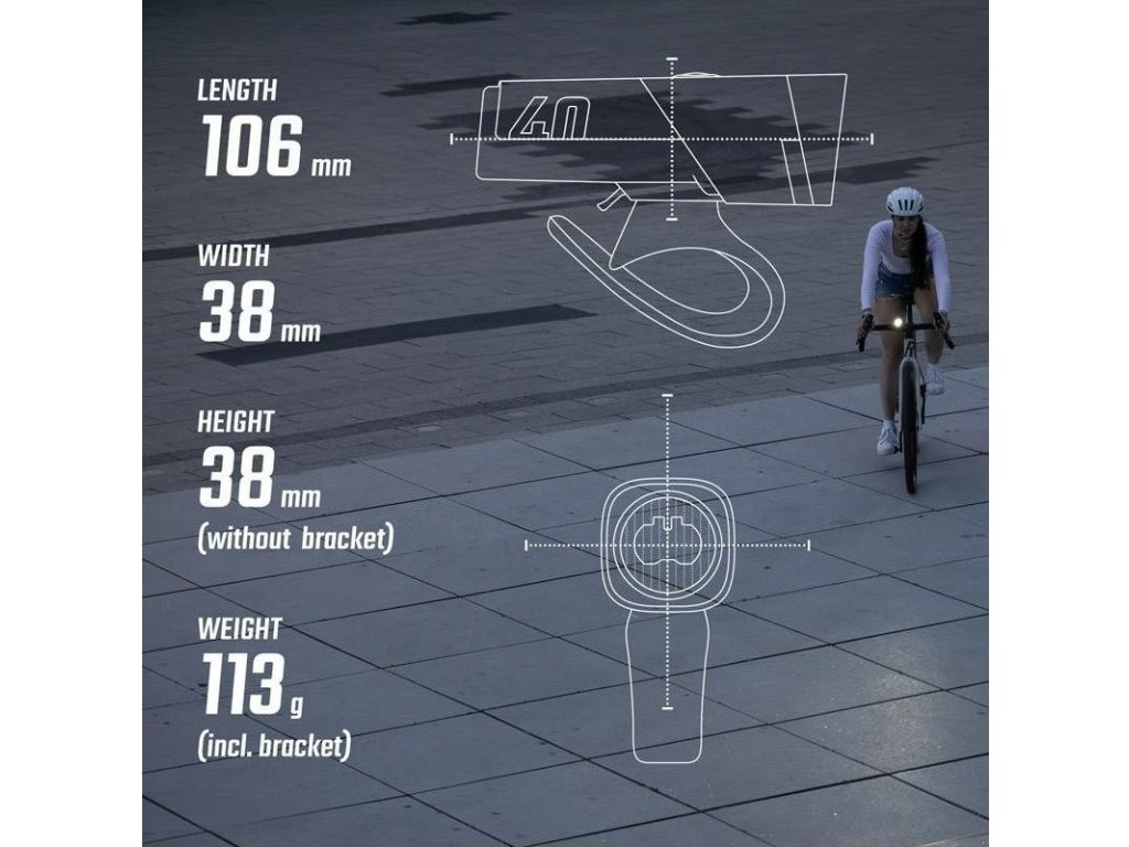 AURA 40 se připevní k řidítkům pomocí silikonového držáku nastavitelného o 360°. Konstrukce umožňuje rychlé upevnění nebo odstranění bez použití nářadí. Světlo bez problému připevníte horizontálně i vertikálně podle potřeby na