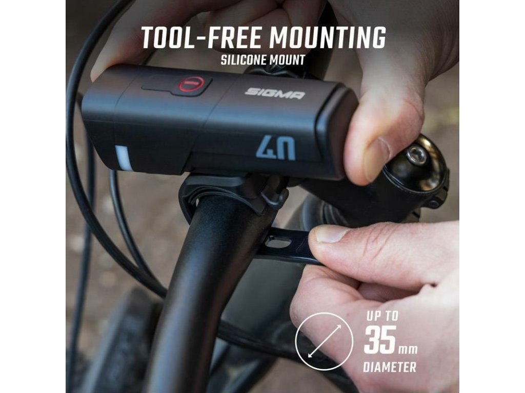 AURA 40 se připevní k řidítkům pomocí silikonového držáku nastavitelného o 360°. Konstrukce umožňuje rychlé upevnění nebo odstranění bez použití nářadí. Světlo bez problému připevníte horizontálně i vertikálně podle potřeby na