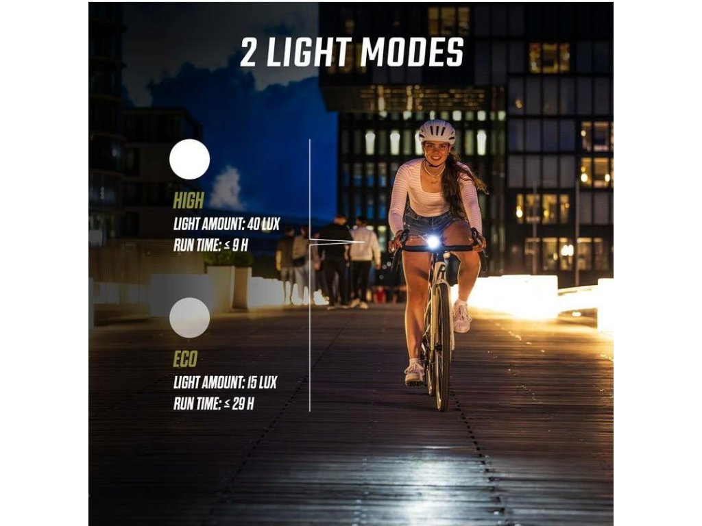 AURA 40 je každodenním společníkem v městském provozu. Světlo s vylepšeným světelným kuželem, dosvitem 50 metrů a výdrží baterie až 9 hodin zajišťuje větší bezpečnost a viditelnost v silničním provozu. Díky připojení USB-C lze světlo nabíjet ještě rychleji a pohodlněji. Světlo AURA 40 se montuje na řídítka bez použití nářadí a jeho ovládání je velmi snadné.
