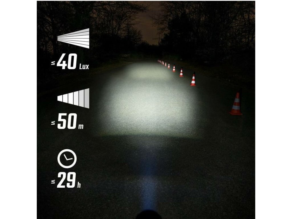 Světlo AURA 40 na jedno nabití dokáže svítit až 29 h v ekonomickém režimu. Doba svícení dle zvolených režimů: 9 h standardní / 29 h ekonomický.