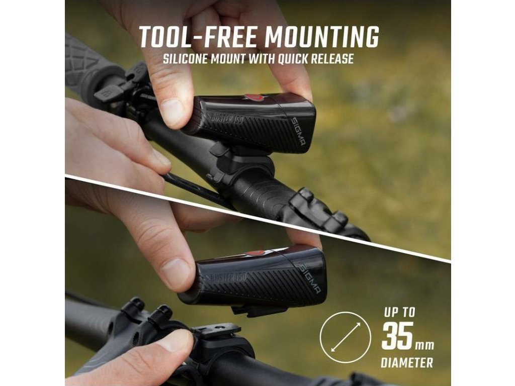 Buster 150 lze díky silikonovému držáku namontovat bez použití nářadí na řídítka během pár sekund. Podle potřeby se dá horizontálně i vertikálně vyrovnat a perfektně tak dosedne i na prohnutá řídítka. Díky integrovanému jezdci lze Buster 150 z držáku snadno sejmout a znovu nasadit. Držák na řídítka je vhodný pro řídítka o průměru 22–35 mm.