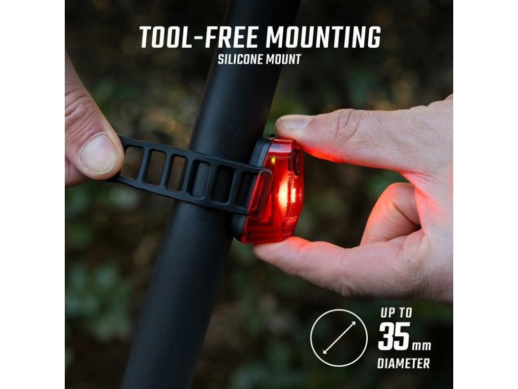 K montáži NYTE 10 nepotřebujete žádné nářadí. Díky pružnému silikonovému pásku jej lze snadno a během několika sekund připevnit ke všem standardním sedlovkám.
