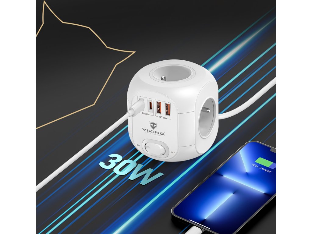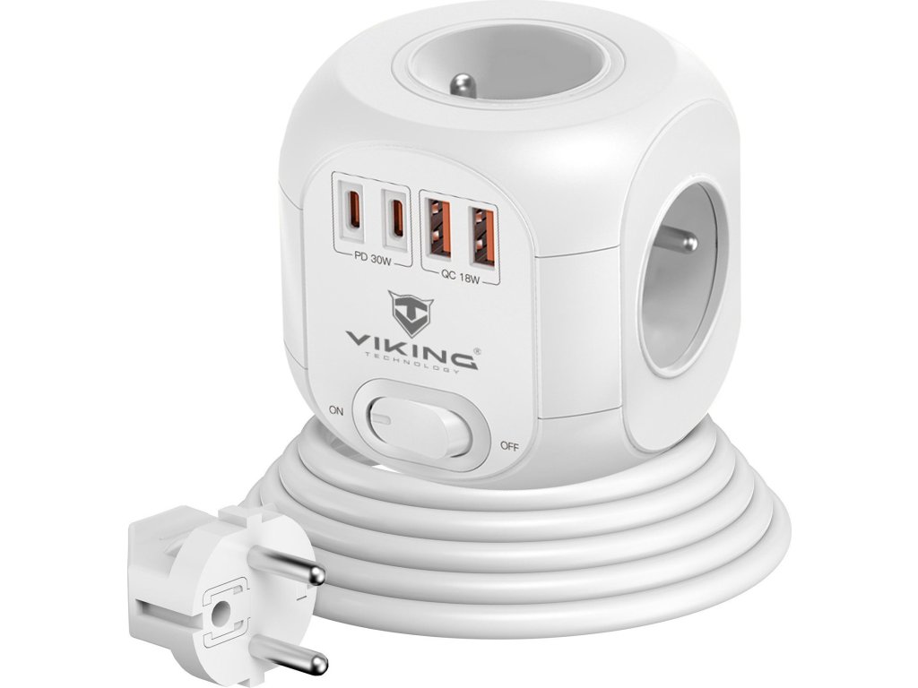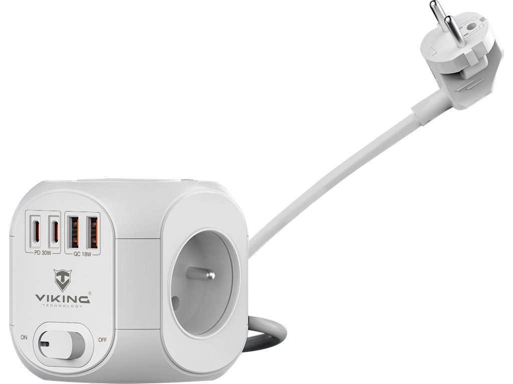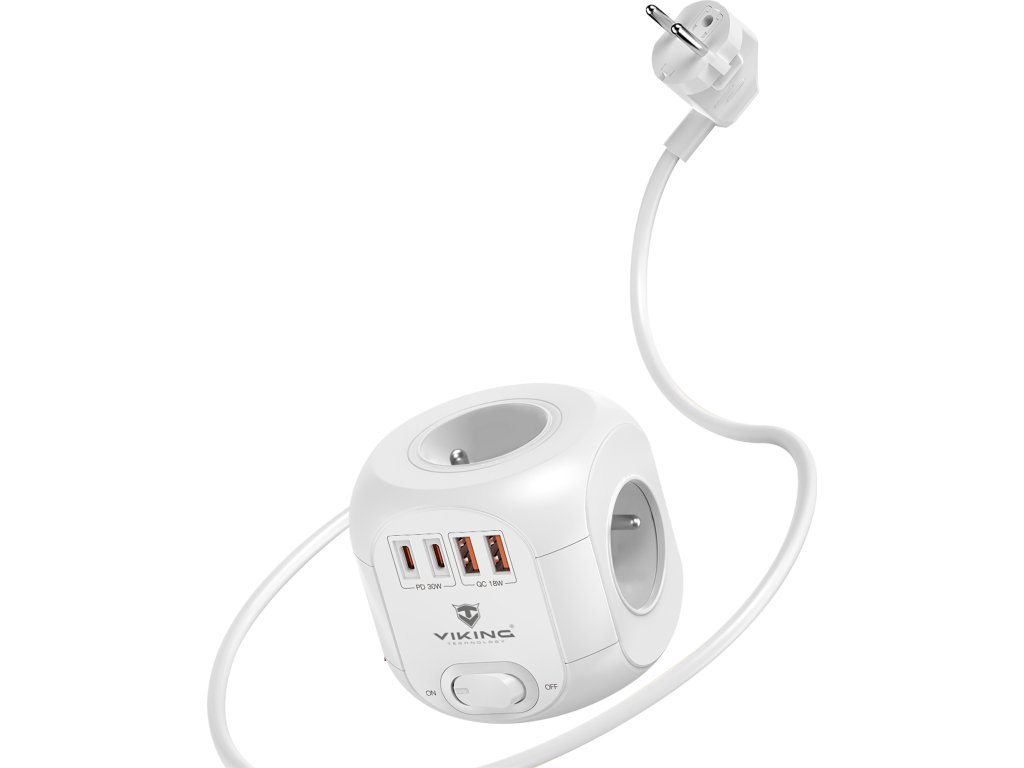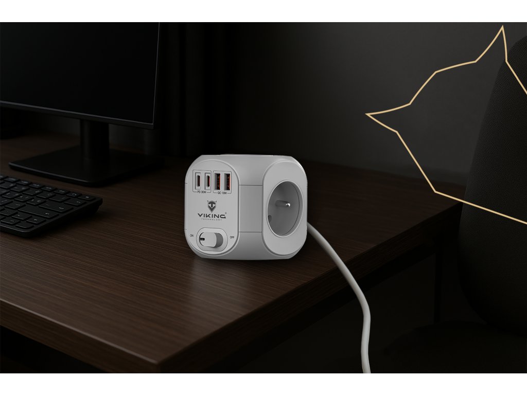 Viking AC CUBE PD30 kombinuje čtyři USB porty (2× USB-C, 2× USB-A), čtyři síťové zásuvky a 1,8m prodlužovací kabel v jednom elegantním a prostorově úsporném zařízení. Umožňuje současně napájet až osm spotřebičů nebo elektroniky, aniž by zbytečně zabíral místo na pracovním stole.