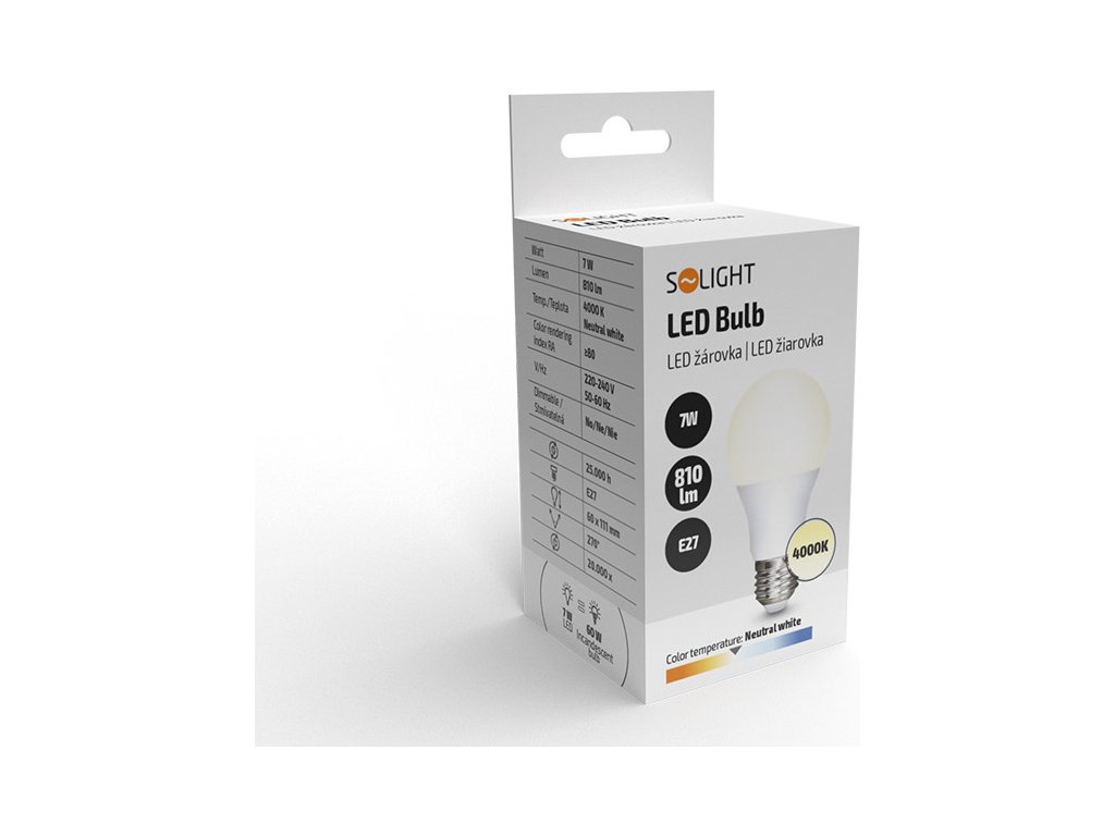 Solight LED žárovka, klasický tvar, 7W, E27, 4000K, 270°, 810lm