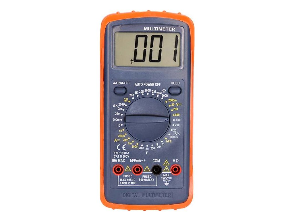 MultimetrDigitální multimetr pro měření napětí, proudu, odporu a kapacity. Nabízí test spojitosti obvodu, diodový test a měření hFE (0-1000). Funkce automatického vypnutí a uchování poslední hodnoty. Ochrana proti přetížení a indikace vybité baterie. Napětí: DC 2000mV - 600V (± 0,5%), AC 2000mV - 600V (± 1%), proud: DC 200uA - 10A (± 1,8%), rezistence: 200? - 200M? (± 1%). Kapacita: 2nF - 20uF (± 4%). Napájení: 9V baterie (nejsou součástí balení). Rozměry: 193x90x37 mm, hmotnost: 251g.