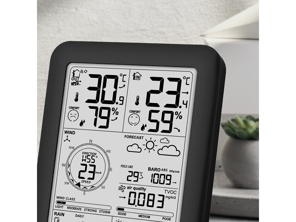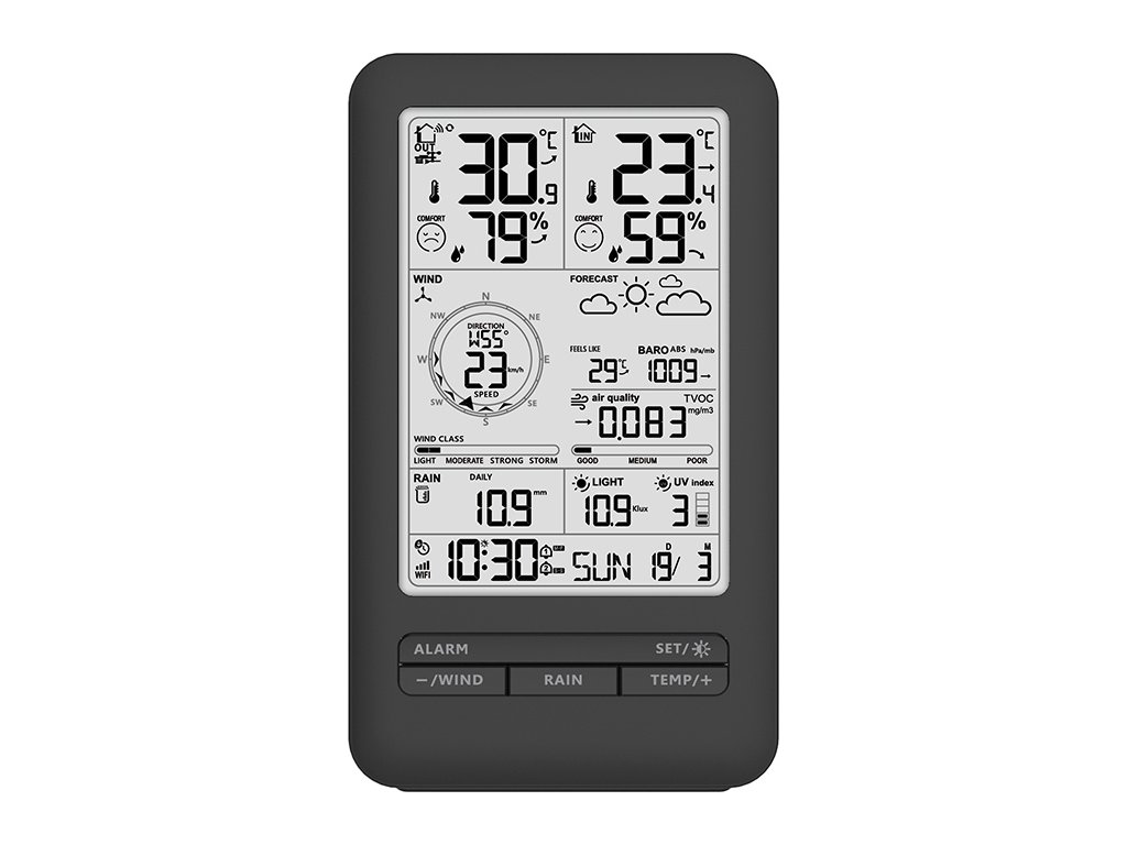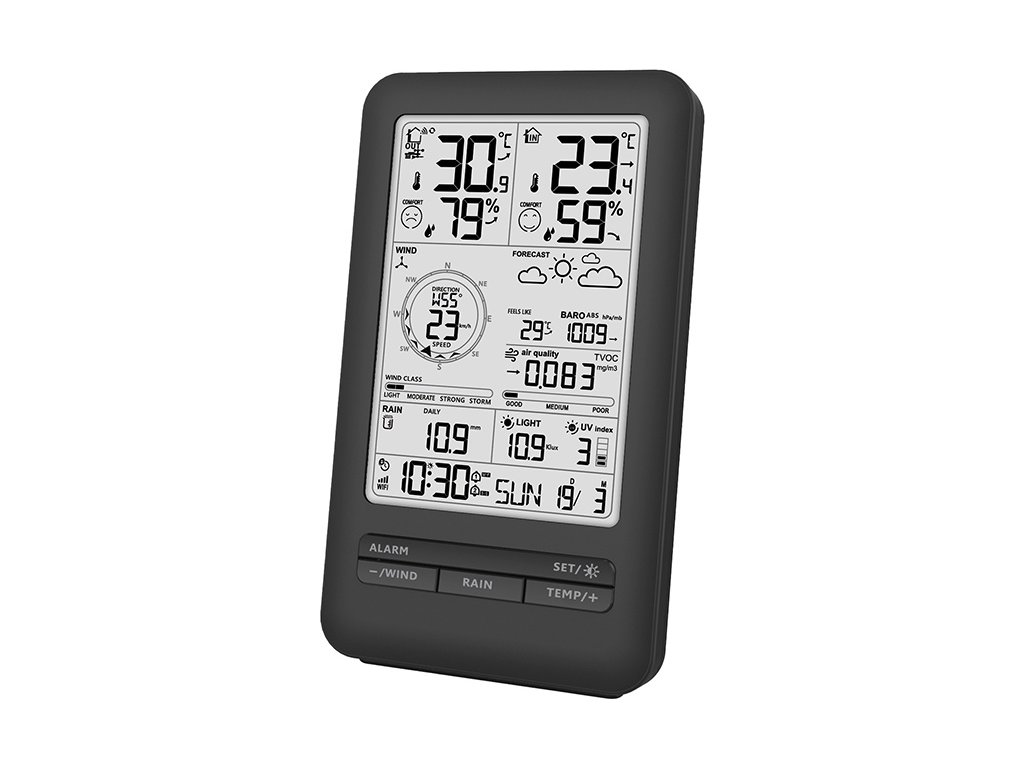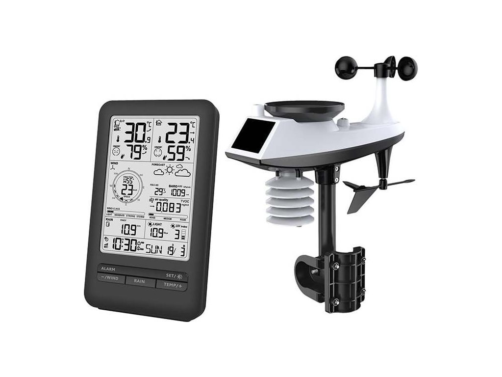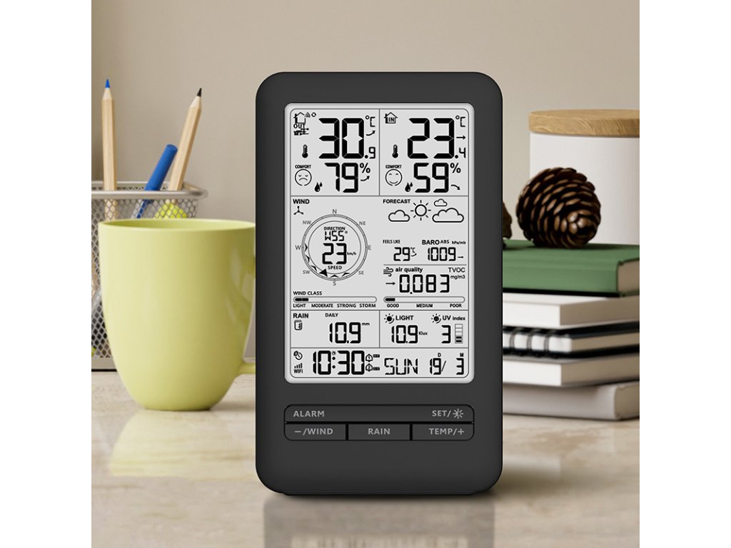 Profesionální smart WIFI meteostaniceTato profesionální meteostanice poskytuje kompletní přehled o počasí a kvalitě ovzduší s možností propojení s aplikací Smart Life / Tuya Smart, kde lze zobrazit aktuální hodnoty a přehledné grafy meteorologických dat. Nabízí automatické nastavení času přes internet, kalendář do roku 2099, zobrazení dnů v týdnu ve 15 jazycích, dva budíky s funkcí odloženého buzení (OFF nebo 5–60 min) a monitorování kvality ovzduší pomocí snímače škodlivých látek TVOC s 8 úrovněmi koncentrace (0–9,999 mg/m3). Měří vnitřní (-20 °C až 50 °C) a venkovní teplotu (-40 °C až 70 °C), vlhkost (20 % až 95 %), atmosférický tlak (600–1100 hPa), srážky (0–9999 mm) a vítr (rychlost do 180 km/h, směr 0–359°) s 12 úrovněmi Beaufortovy stupnice. Sleduje intenzitu světla (0–128 klux), UV index (0–15) a úroveň sluneční expozice. Disponuje 4 úrovněmi podsvícení displeje pro perfektní čitelnost. Bezdrátový senzor s frekvencí 433,92 MHz RF má dosah až 100 m v otevřeném prostoru a umožňuje připojení až 3 dalších senzorů vlhkosti a teploty. Napájení meteostanice zajišťuje DC 5V / 1A adaptér nebo 2× AA baterie, měřící konzole 3× AA baterie, bezdrátové senzory 2× AA baterie. Díky moderním technologiím, široké škále měření a propojení s aplikací je ideální volbou pro všechny, kteří chtějí mít profesionální meteorologická data v reálném čase.