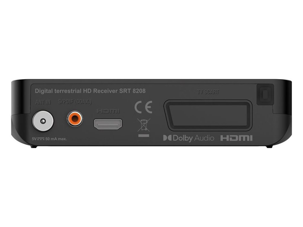 Porty: 1× USB 2.0, 1× RF vstup, 1× koax (S/PDIF), 1× HDMI, 1× SCART