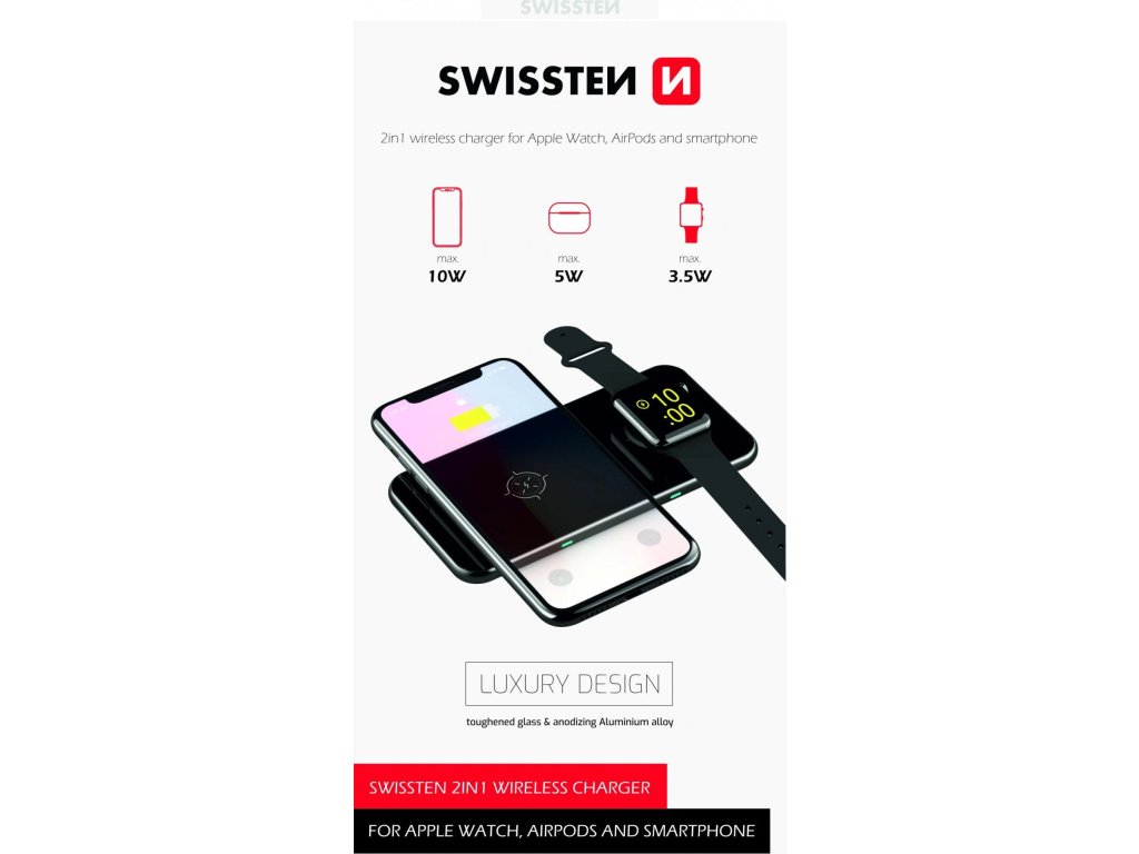 Ultratenká bezdrátová nabíječka SWISSTEN 2v1 pro nabíjení smartphonů, AirPods nebo Apple Watch. Baleno v blistru SWISSTENUltratenký design