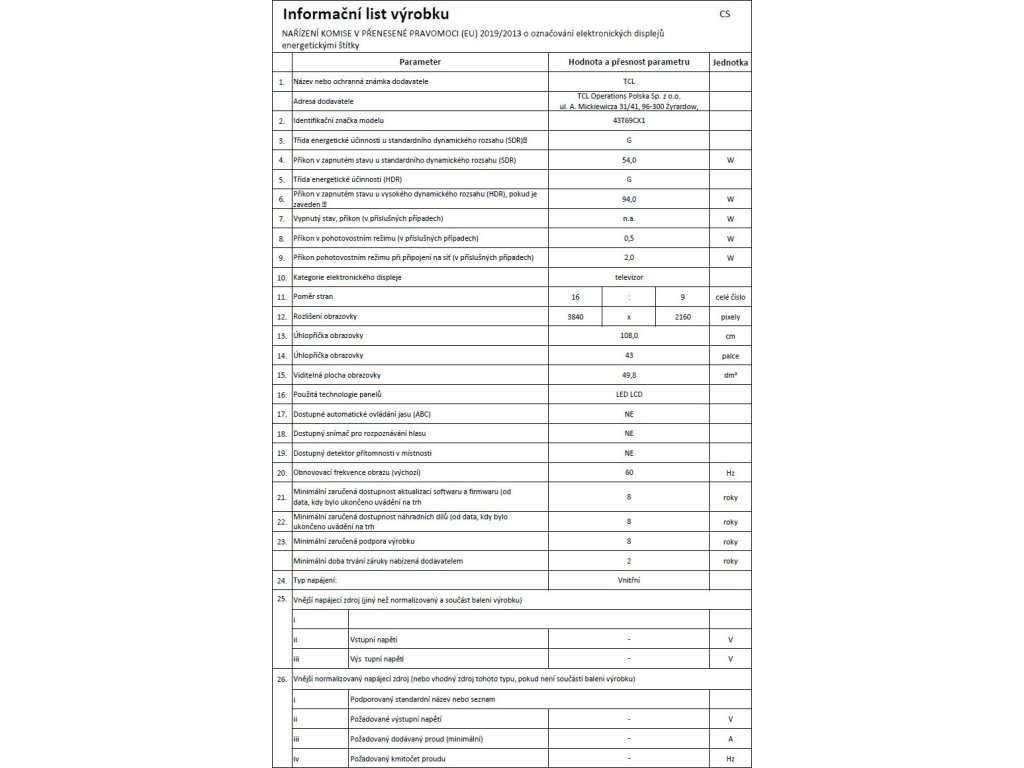 | Úhlopříčka obrazovky: | 108 cm (43") |