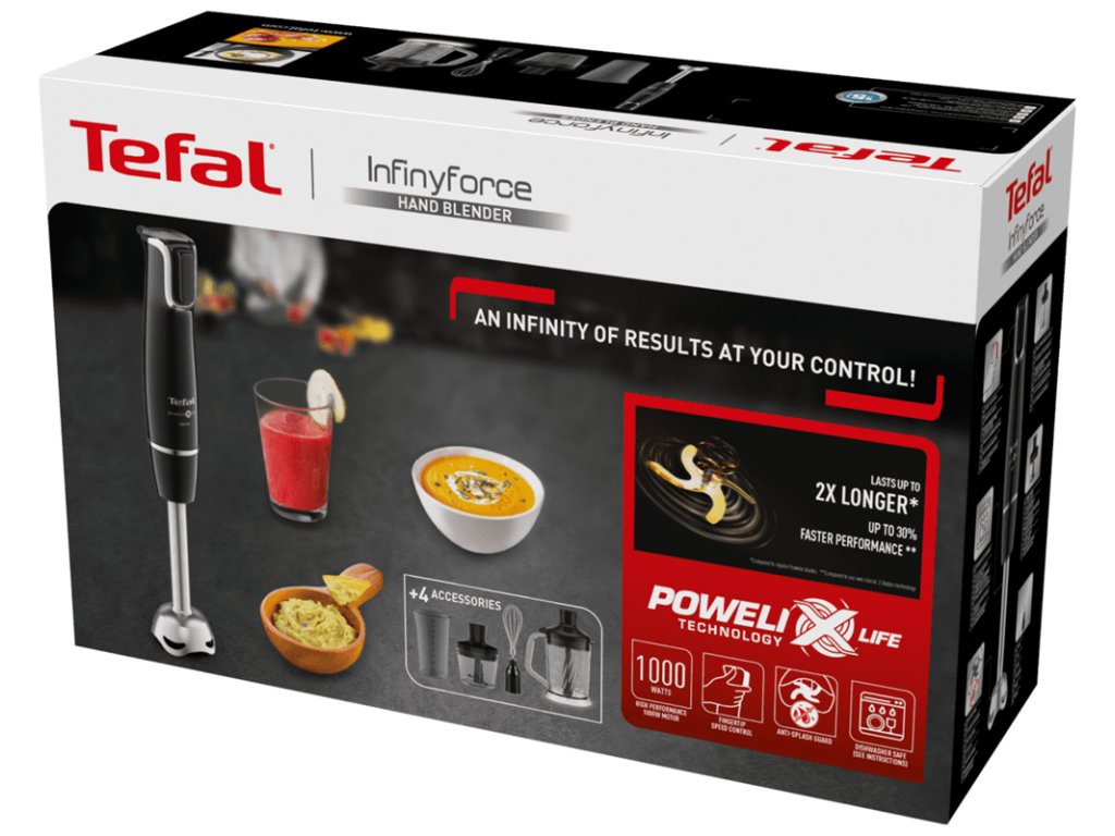 Šlehání, mixování i sekání nyní zvládnete s minimální námahou. Mixér totiž vyniká technologií Powelix, která představuje vysoce výkonné nože s titanovými povrchem pro dokonalé výsledky a extrémní odolnost.Mixér je vybaven silným motorem s příkonem až 1 000 W, a tak si během chvilky poradí s nejrůznějšími druhy surovin. K dispozici vám bude hned několik rychlostí mixování, kdy k jejich nastavení slouží ovládací tlačítko, které je umístěno tak, abyste na něj vždy pohodlně dosáhli. Vylepšená ergonomie rukojeti pak zajistí, že vám mixér dokonale padne do ruky. Infinyforce navíc váží pouze 1,3 kg, takže s ním lze velmi snadno manipulovat.