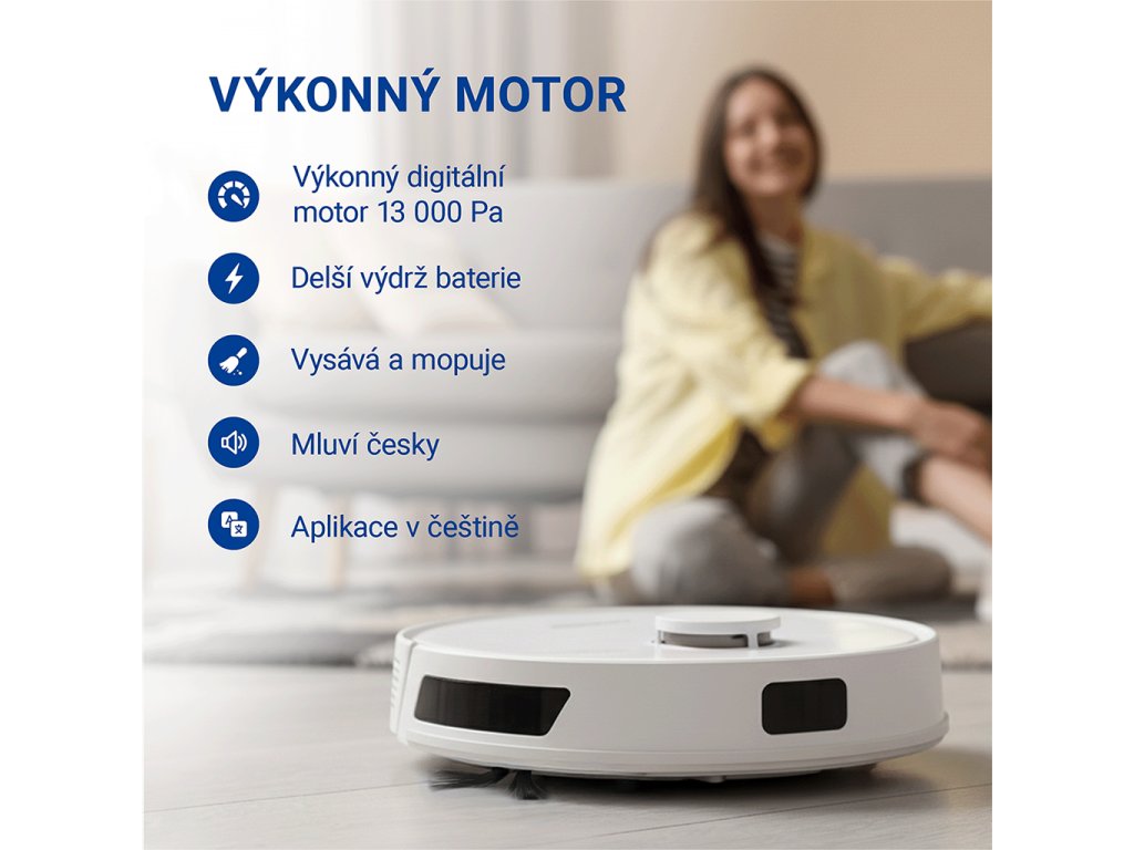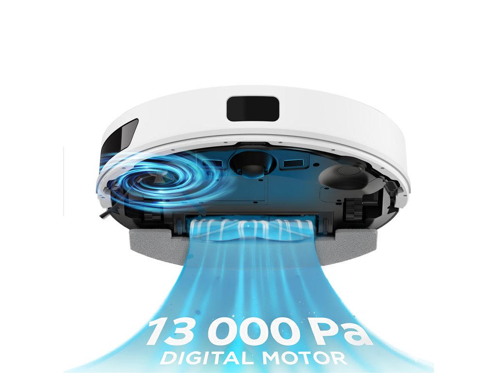 Robotický vysavač je vybaven silným 13 000 Pa sacím digitálním motorem. Inteligentní řízení výkonu, se postará o automatickou regulaci sacího výkonu. Pokud senzory detekují koberec, automaticky se zvýší sací výkon pro hloubkové čištění koberců.