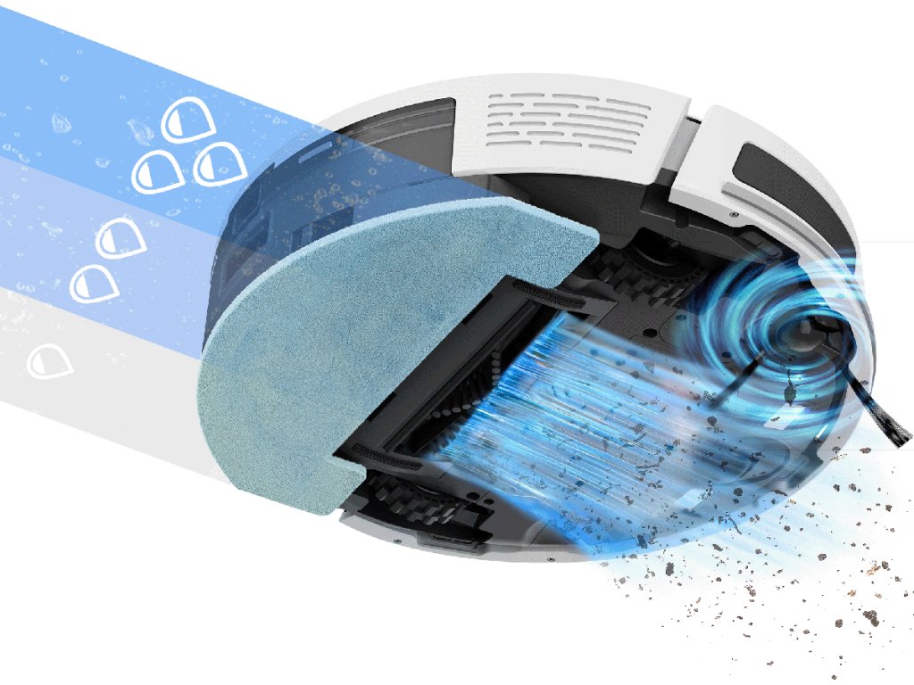 Robotický vysavač je vybaven elektronicky řízenou regulací průtoku vody pro optimalizované mokré stírání ve třech krocích, nízká, střední nebo vysoká intenzita pro velmi znečištěnou podlahu.