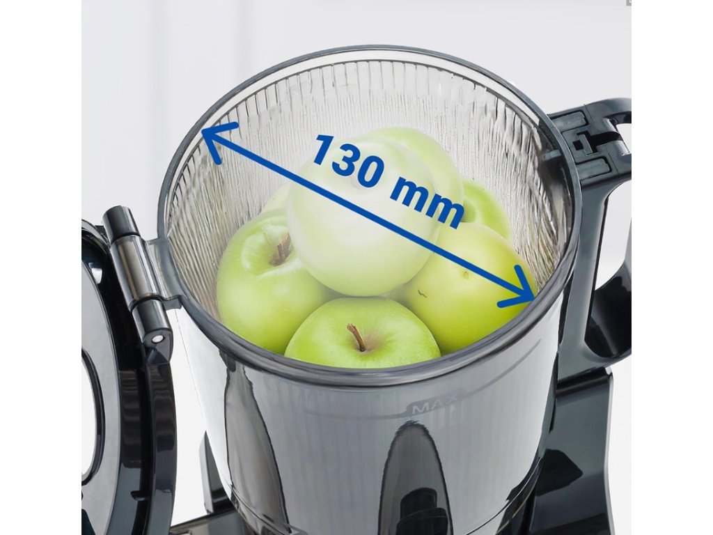 S odšťavňovačem TESLA SlowJuicer SJ770 XXL Deluxe vytvoříte chutné a zdravé džusy, sorbety, ovocné směsi pro zmrzlinu nebo veganská ořechová mléka za několik minut bez krájení, hluku a nepořádku. Stačí vložit celá jablka, hrušky, mrkve nebo jiné plody do velkého plnícího otvoru o průměru 13 cm.