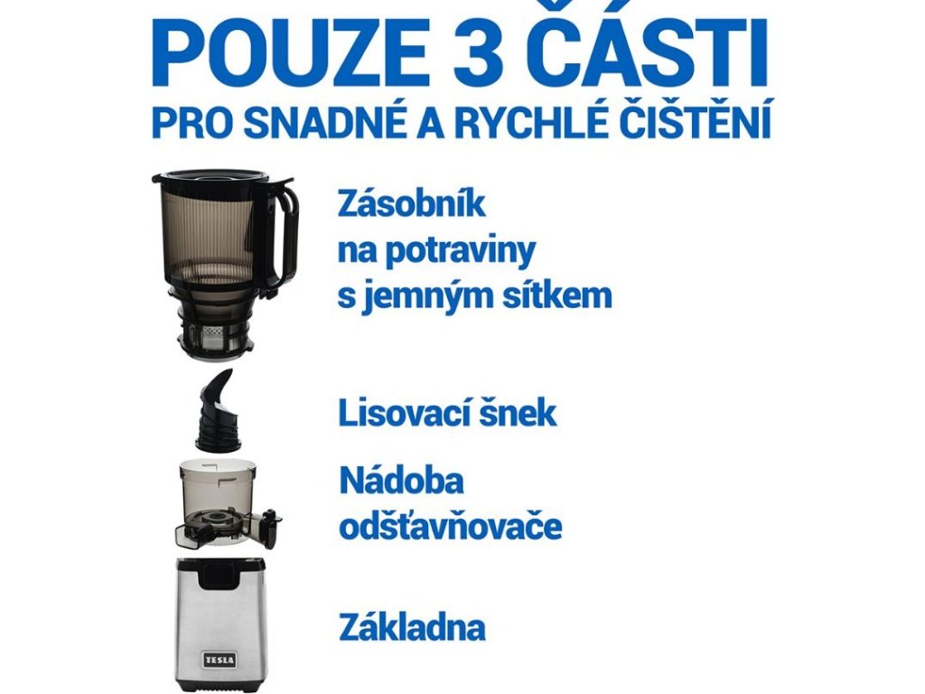 Konstrukce TESLA SlowJuicer SJ770 XXL Deluxe je velmi jednoduchá, abyste nemuseli ztrácet čas při sestavování a čištění odšťavňovače. Konstrukce se skládá jen ze tří součástí: zásobníku s vestavěným jemným filtrem, lisovacího šneku a nádoby odšťavňovače, které lze rychle a snadno složit a rozložit.