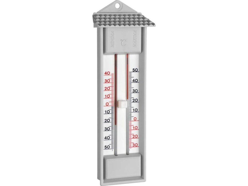 Kapalinový teploměr s označením max-min teploty. Mezi kapilárami je tlačítko, které ruší označení naměřených teplot. Vyrobeno z šedého plastu. Kapilára bez rtuti.Technické informace: