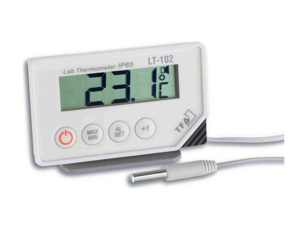 Profesionální laboratorní kontrolní teploměr TFA 30.1034 je dodáván se stojánkem a s magnetickým držákem, je odolný proti stříkající vodě (krytí IP 65) a z tohoto důvodu jej můžete snadno čistit. Rychlá reakční doba (cca 10 vteřin), je vhodná k měření teploty potravin jakož i pro měření teplot v laboratořích a ve školách. Čidlo měření teploty je z nerezové oceli s kabelem o délce 3 m. Samotné čidlo je provedeno jako ponorný senzor.Pomocí tohoto teploměru je možné měřit teplotu v akváriích, v teráriích nebo jím můžete teplotu půdy (zeminy) při pěstování květin a jiných rostlin. Přístroj je vybaven funkcí podržení zobrazené naměřené hodnoty na displeji, funkcí zobrazení maximální a minimální naměřené teploty a alarmem (akustický i optický), který vás upozorní na příliš vysokou nebo příliš nízkou teplotu.