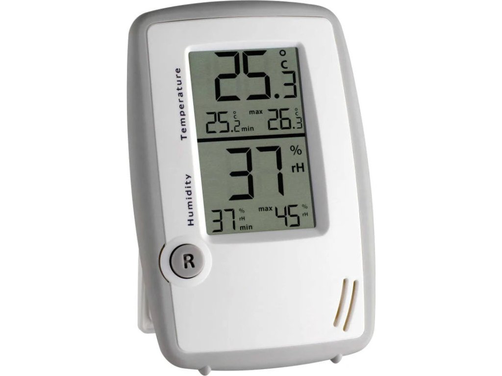 Digitální teploměr s vlhkoměrem TFA 30.5015 měří pokojovou teplotu v rozsahu -10 °C až +70 °C a pokojovou vlhkost v rozsahu 20-99 %. Displej přístroje zobrazuje neustále denní min. a max. naměřené hodnoty (sám si je resetuje v nastavenou dobu). Kromě toho si přístroj pamatuje také naměřené min. a max. hodnoty od posledního manuálního vyresetování.Technické informace: