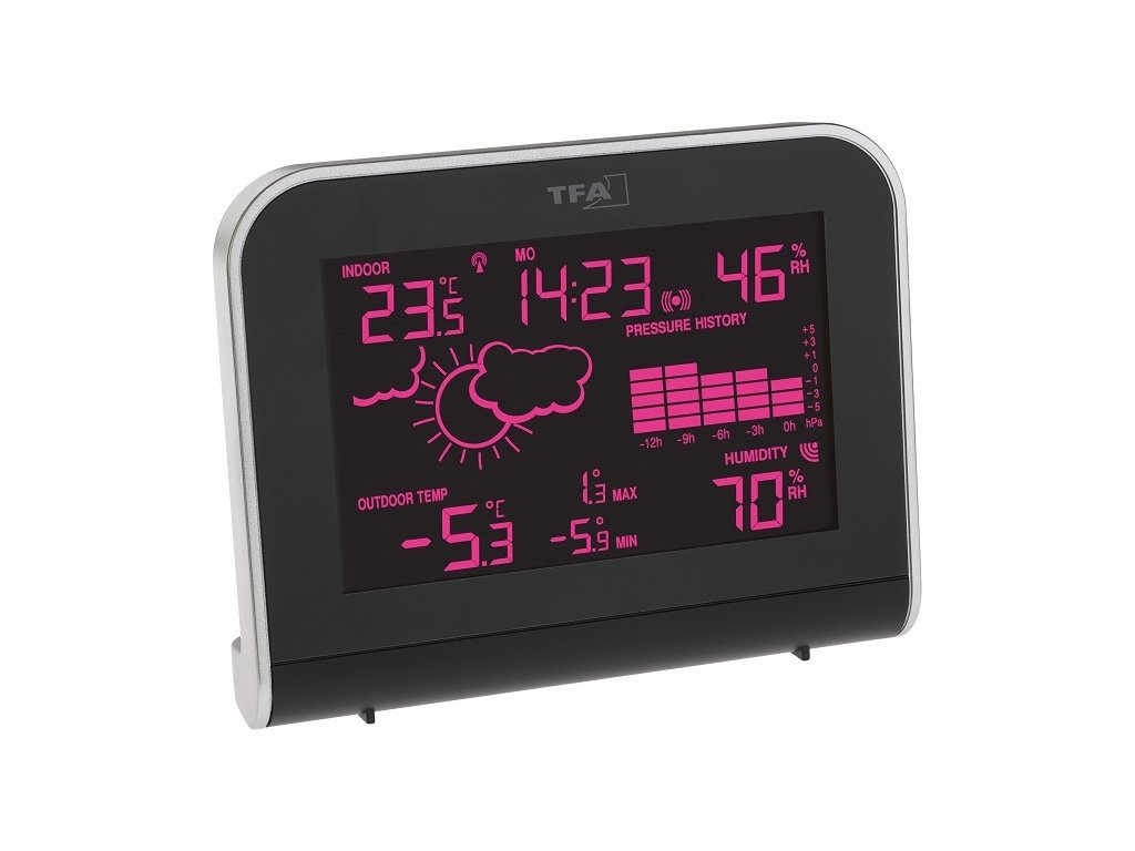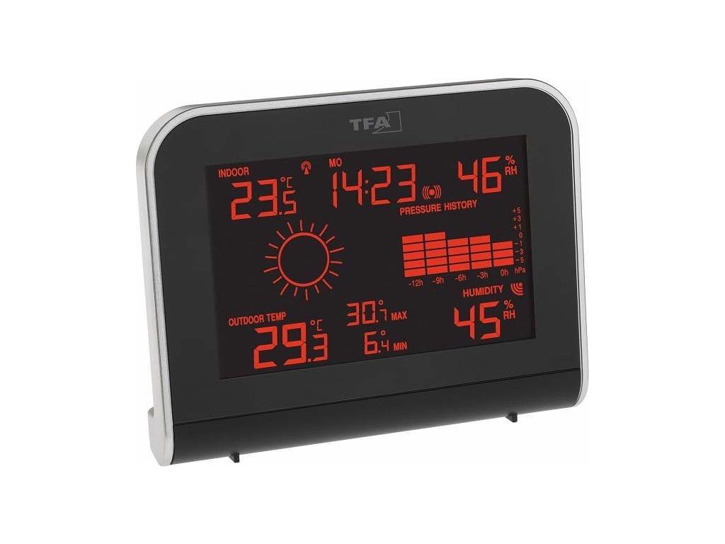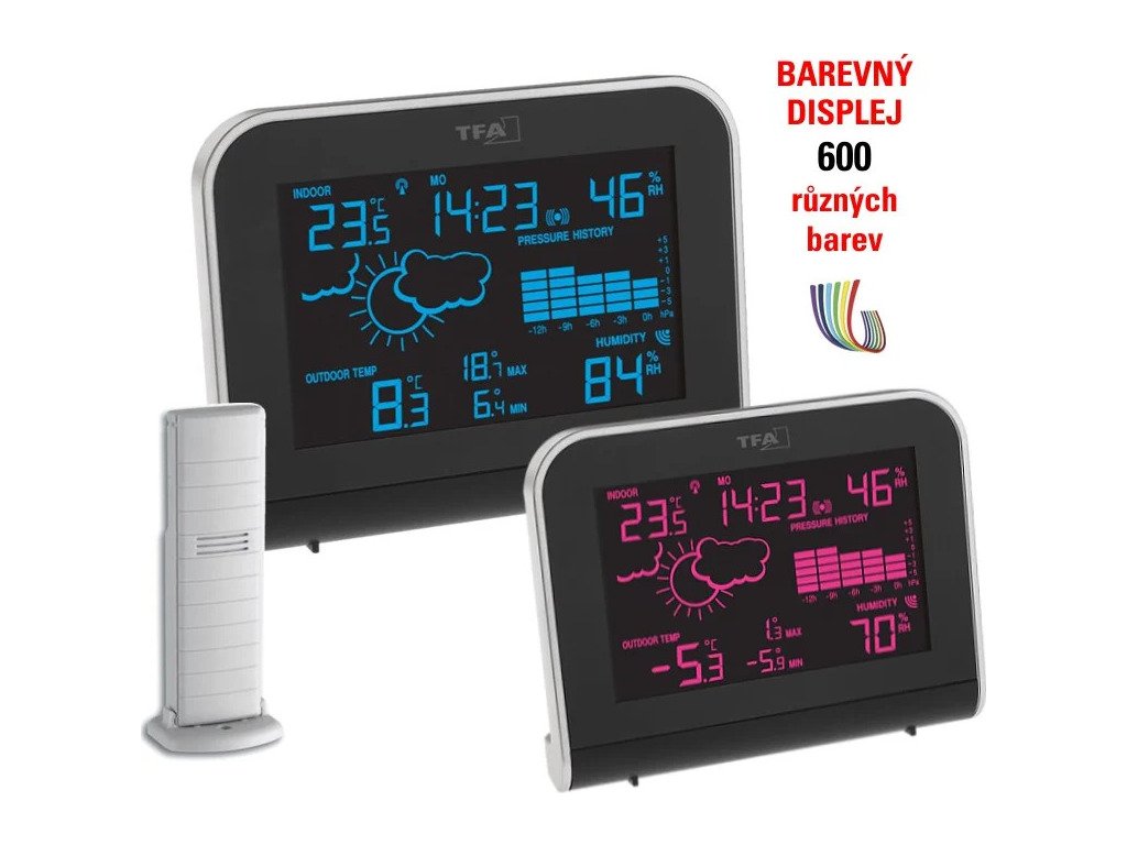 Meteostanice TFA Sphere disponuje špičkovým barevným displejem s vysokým kontrastem, který umožňuje několik režimů zobrazení: automatické prolínání mezi 600 barvami textu, změna barvy textu na základě aktuální venkovní teploty (22 barev) nebo pevně nastavená barva textu.Stanice Sphere dále nabízí: